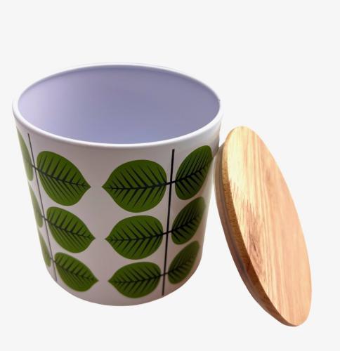 En härlig teburk i plåt med mönstret Berså med trälock. Trälocket har en gummiring som gör att burken sluter tätt.