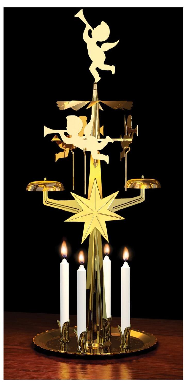 4 st ljus ingår i förpackningen. Det klassiska änglaspelet är en svensk design av Eric Boberg sedan 1948, då originalet var i mässing.