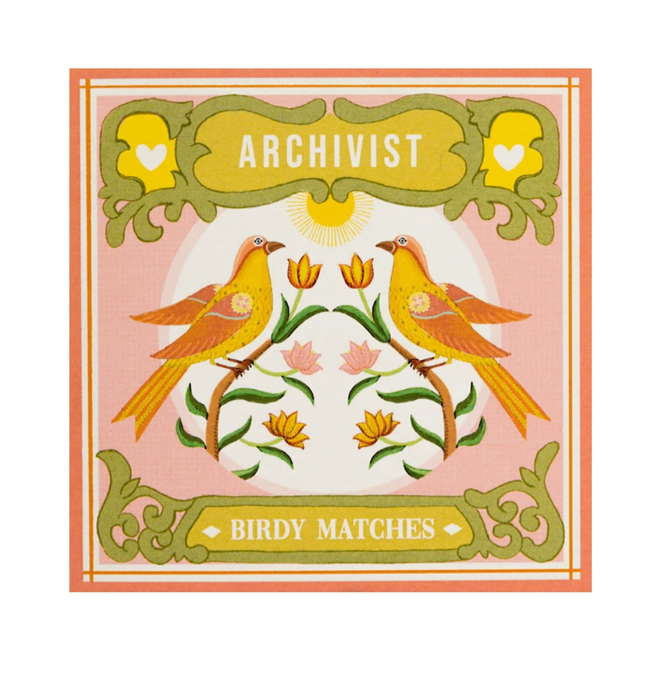 125 st tändstickor, 10cm, med gula toppar. Kommer i en kvadratisk ask med motiv på två fåglar sittande på en blomkvist och texten ”Birdy Matches”