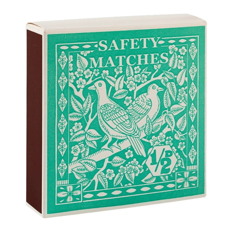 125 st tändstickor, 10cm, med vita toppar. Kommer i en kvadratisk ask med motiv på duvor i grön bakgrund och texten ”Safety Matches”