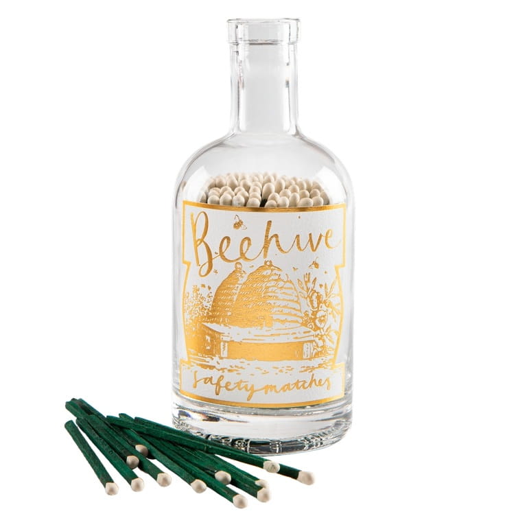 125 st gröna tändstickor, 10cm, med vita toppar. Kommer i en glasflaska med guldigt trycka på bikupa. Fin detalj att ha framme i sitt hem!
