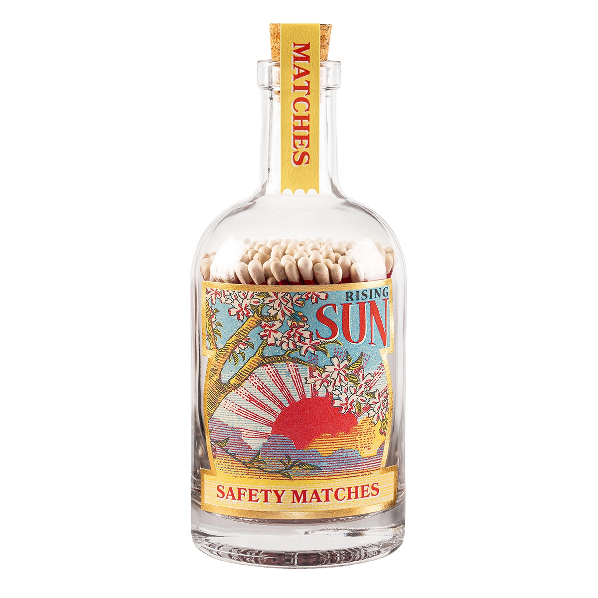 125 st röda/orangea tändstickor, 10cm, med vit topp. Kommer i en glasflaska med fin etikett på soluppgång och körsbärsträd. Fin detalj att ha framme!