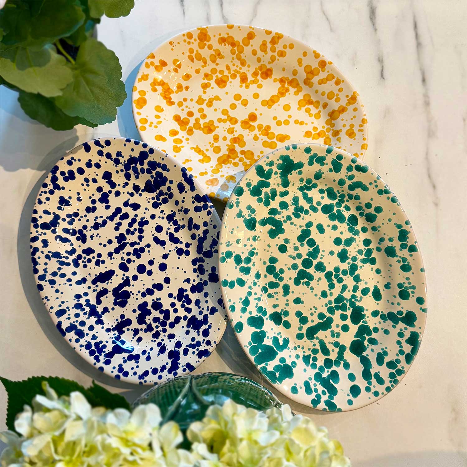 Handgjort ovalt fat från Italien i robust keramik. Unikt handmålad i klassiskt spruzzimönster med gula stänk.