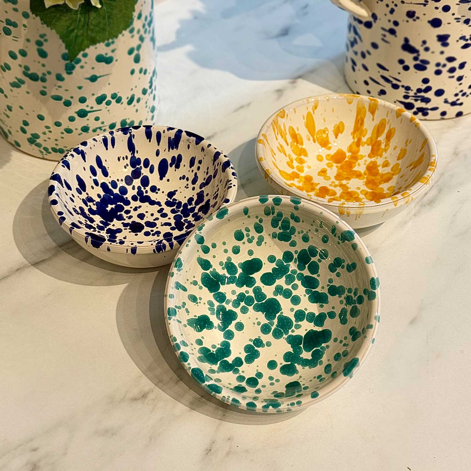 Handgjord skål från Italien i robust keramik. Unikt handmålad i klassiskt spruzzimönster med turkosa stänk.