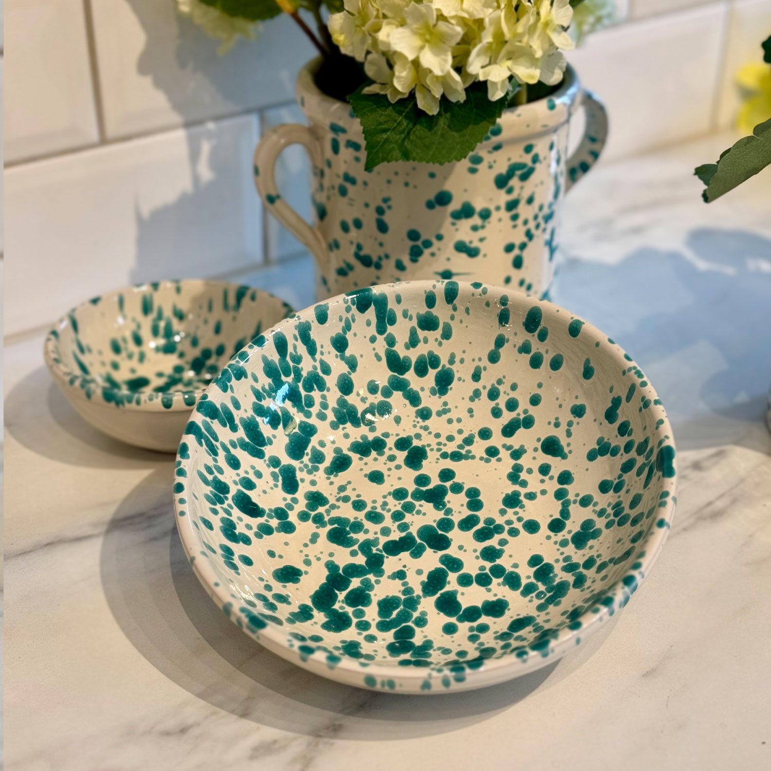 Handgjord skål från Italien i robust keramik. Unikt handmålad i klassiskt spruzzimönster med turkosa stänk.