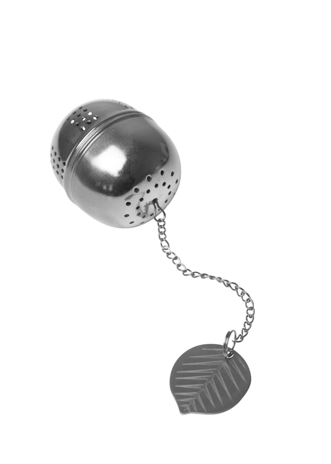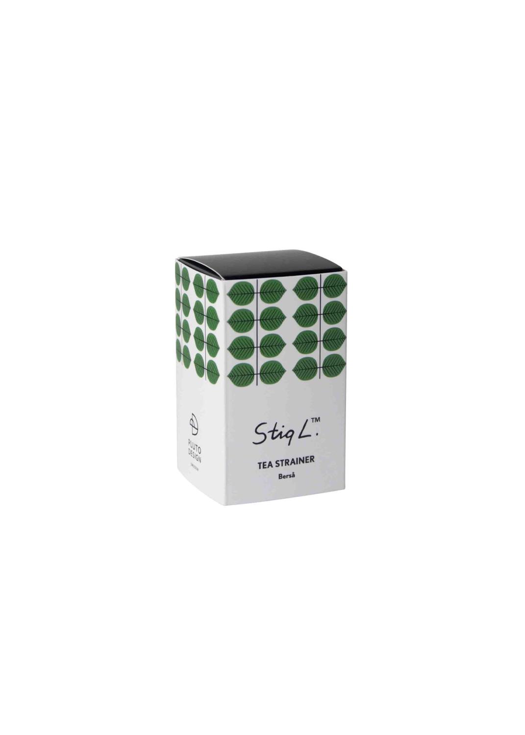 En elegant tesil i silverfärgat rostfritt stål, prydd med det ikoniska bladet från Stig Lindbergs klassiska mönster Berså.