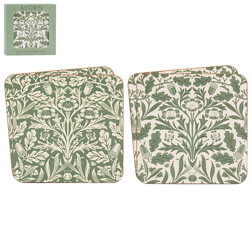 4 st glasunderlägg med kork i William Morris mönster Acorn, i grön vita färger.