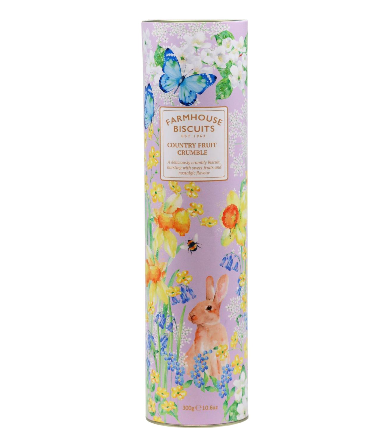 Utsökta havrekakor med torkade frukter. Kommer i en cylinderformad kartong med vackert blommigt mönster och en söt hare.