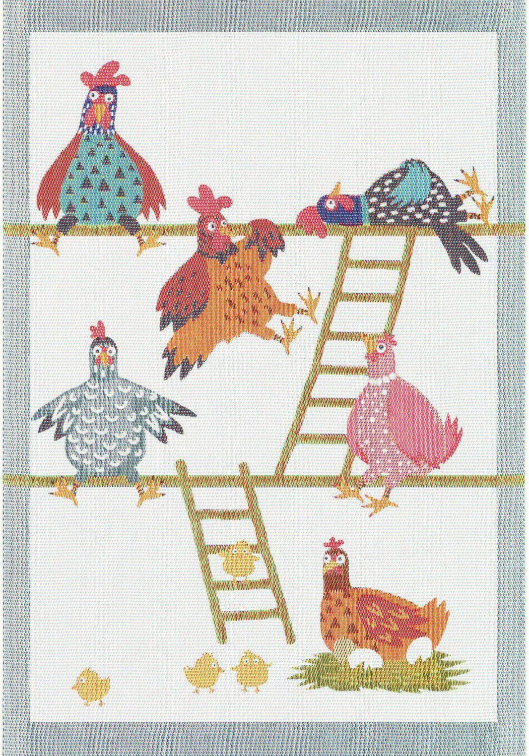 Handduk från Ekelund i motiv på hönor i olika situationer. 100% bomull i måtten 35 x 50 cm.