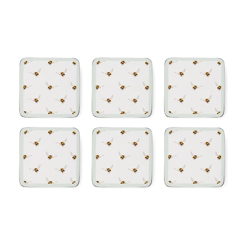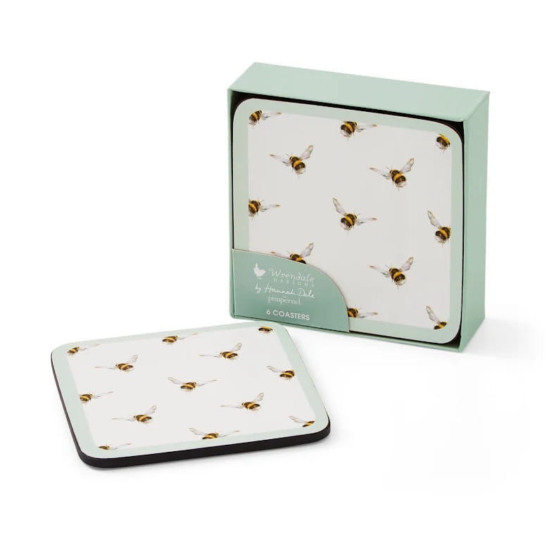 6st söta glasunderlägg med motiv på surrande bin, designat av konstnären Hannah Dale.