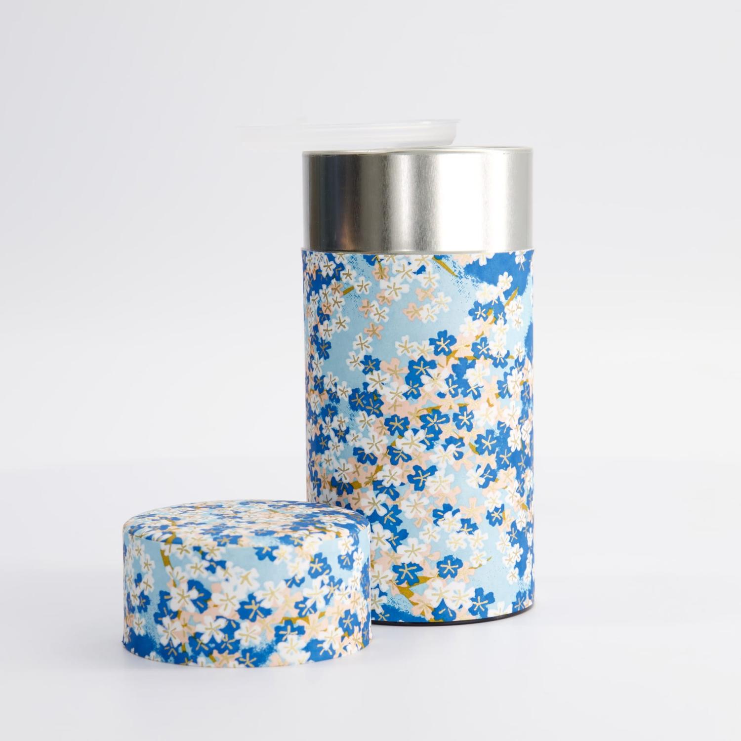 Teburk i blått körsbärs mönster i japansk stil. Rymmer 150g och perfekt att förvara sitt te i.