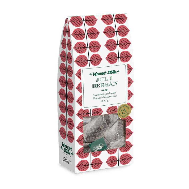 Tepåsar med julblandning, svart te smaksatt med äpple, kryddnejlika, kanel och apelsin i en förpackning med Stig Lindbergs mönster Berså.