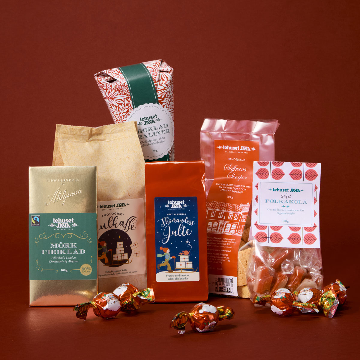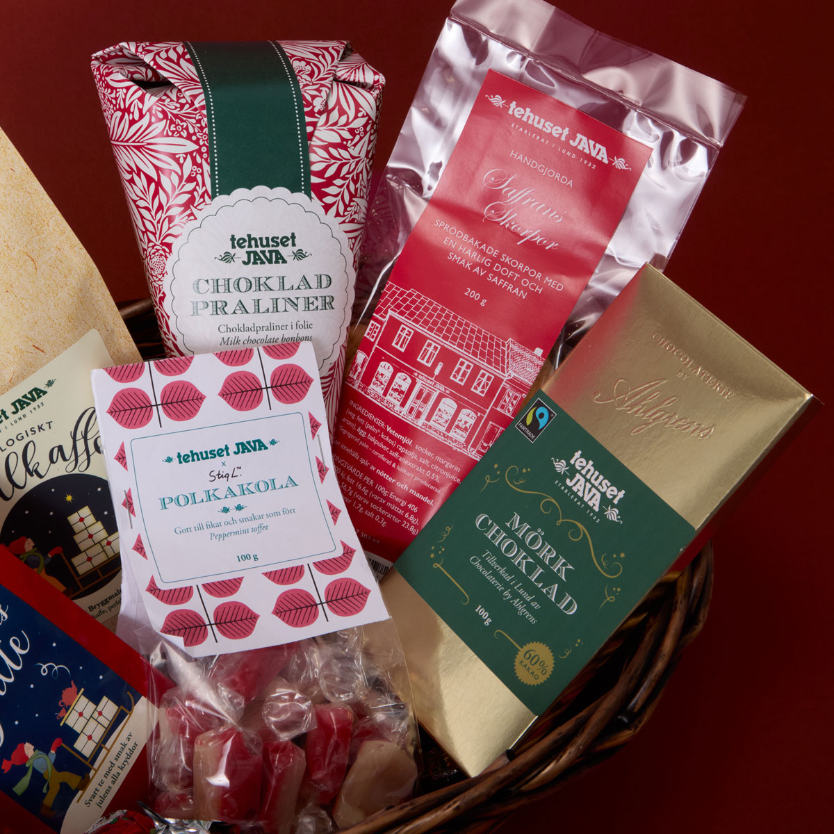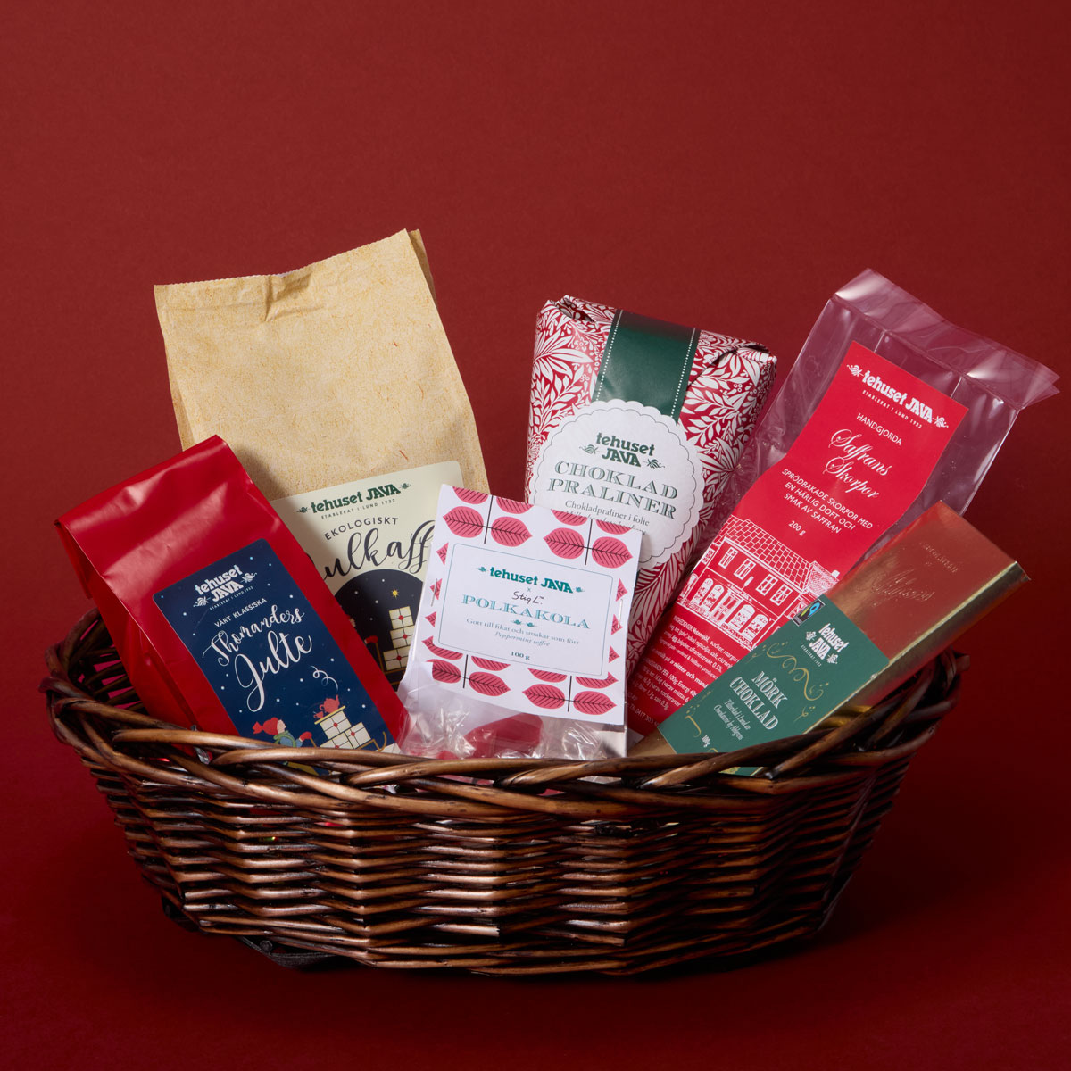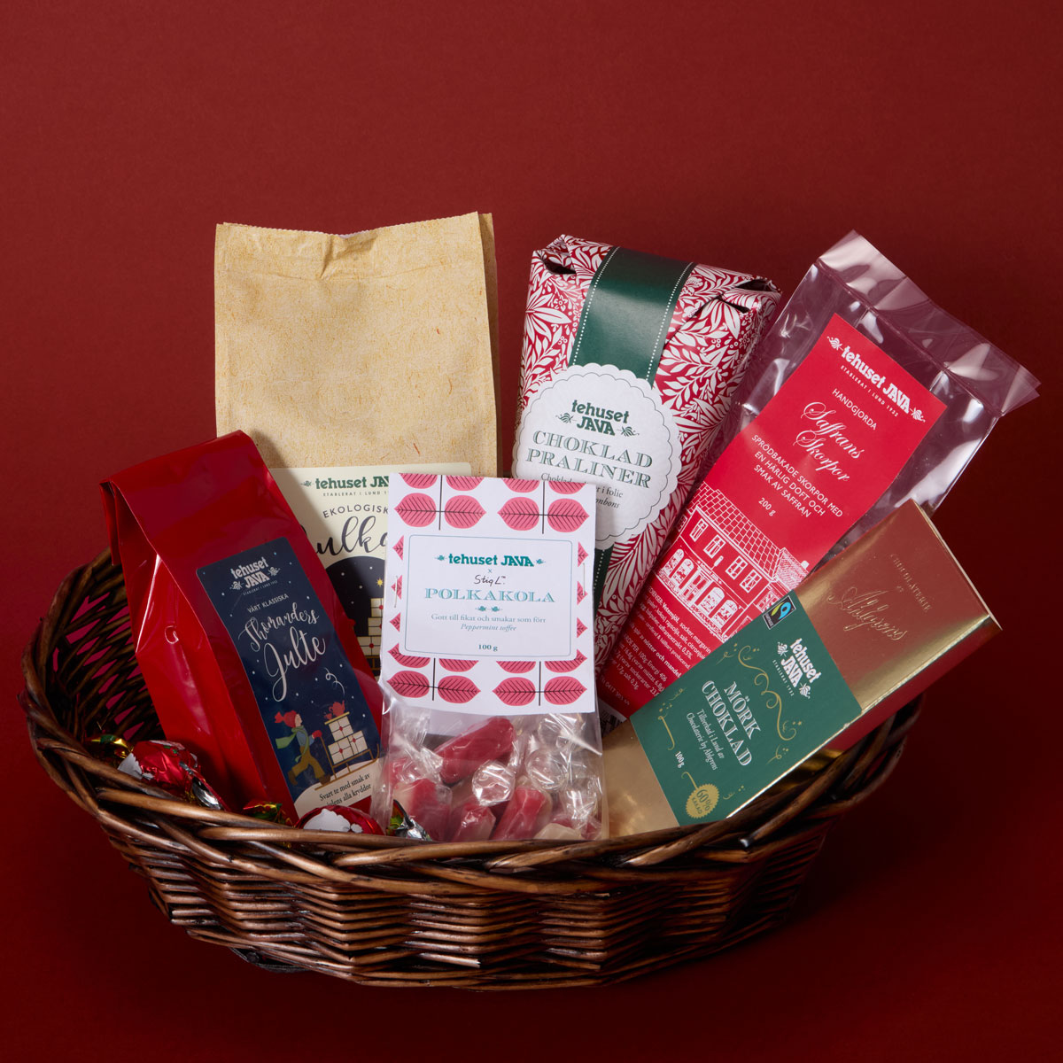 En maffig korg fylld till bredden med julens alla härligheter! Kaffe, skorpor, choklad och godis. Perfekta presenten till någon du tycker om.