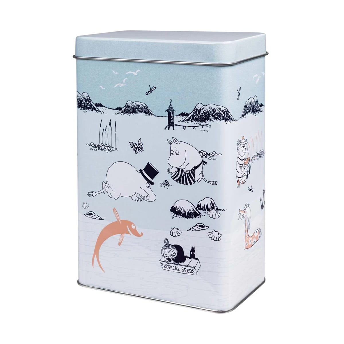 Mumin kaffeburk i blå nyans tillsammans med Muminfigurer på stranden. Perfekt att förvara ditt kaffe i.