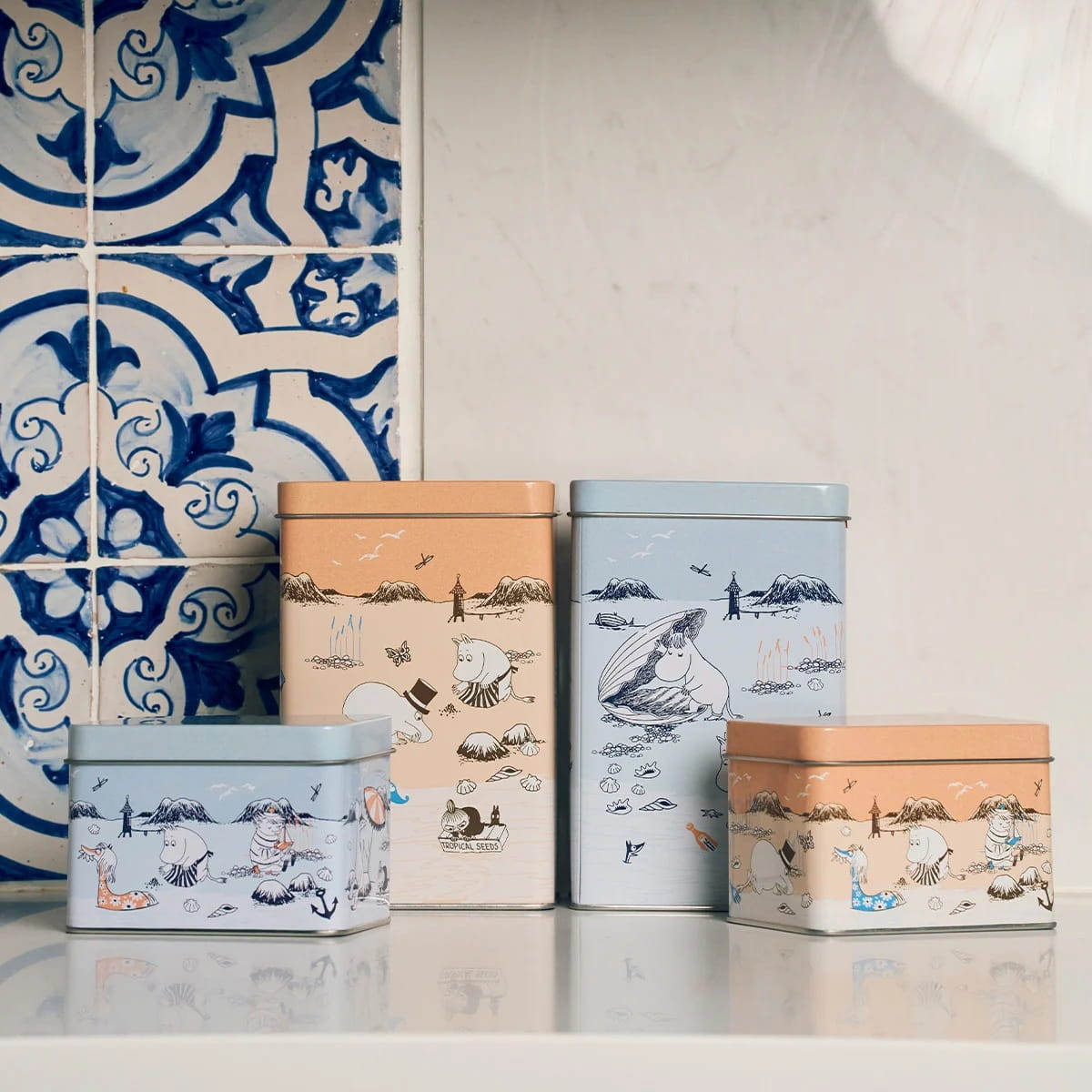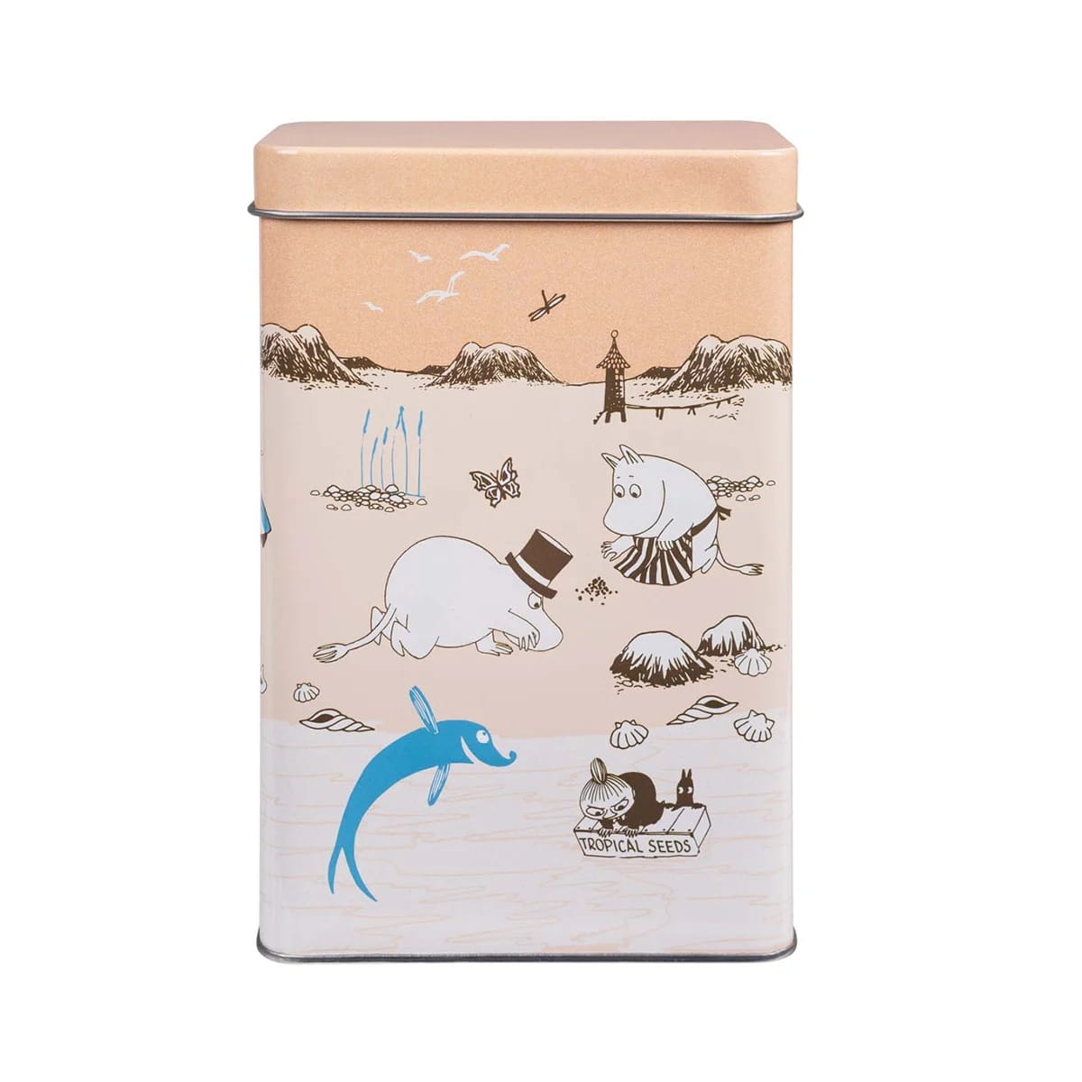 Mumin kaffeburk i orange nyans tillsammans med Muminfigurer på stranden. Perfekt att förvara ditt kaffe i.