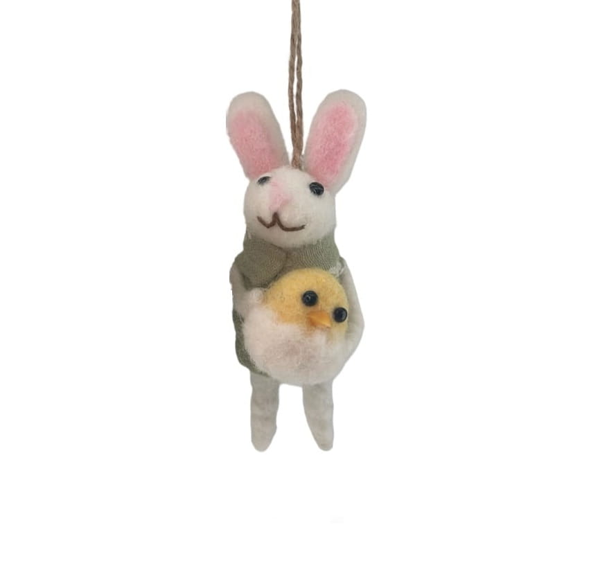 Söt liten kanin med en kyckling i armarna, i ull och måttet 12x6x3,5 cm. Perfekt att hänga i påskriset.