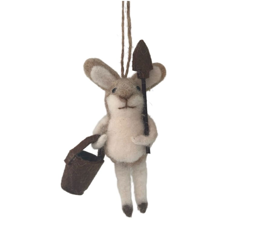 Söt liten kanin med en spade och hink, i ull och måttet 12x6x3,5 cm. Perfekt att hänga i påskriset.