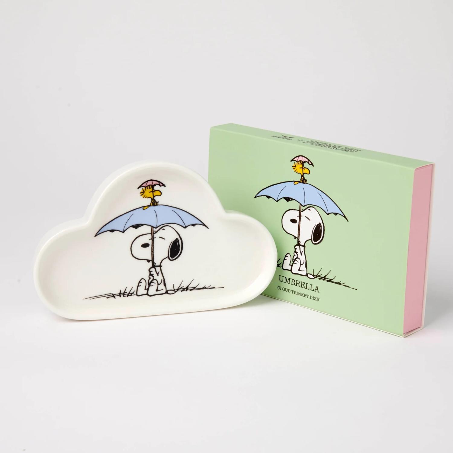 Moln format porslinsfat med snobben och Woodstock och varsitt paraply. Perfekt för godis, kakor eller smycken. Fatet kommer i en fin presentask.