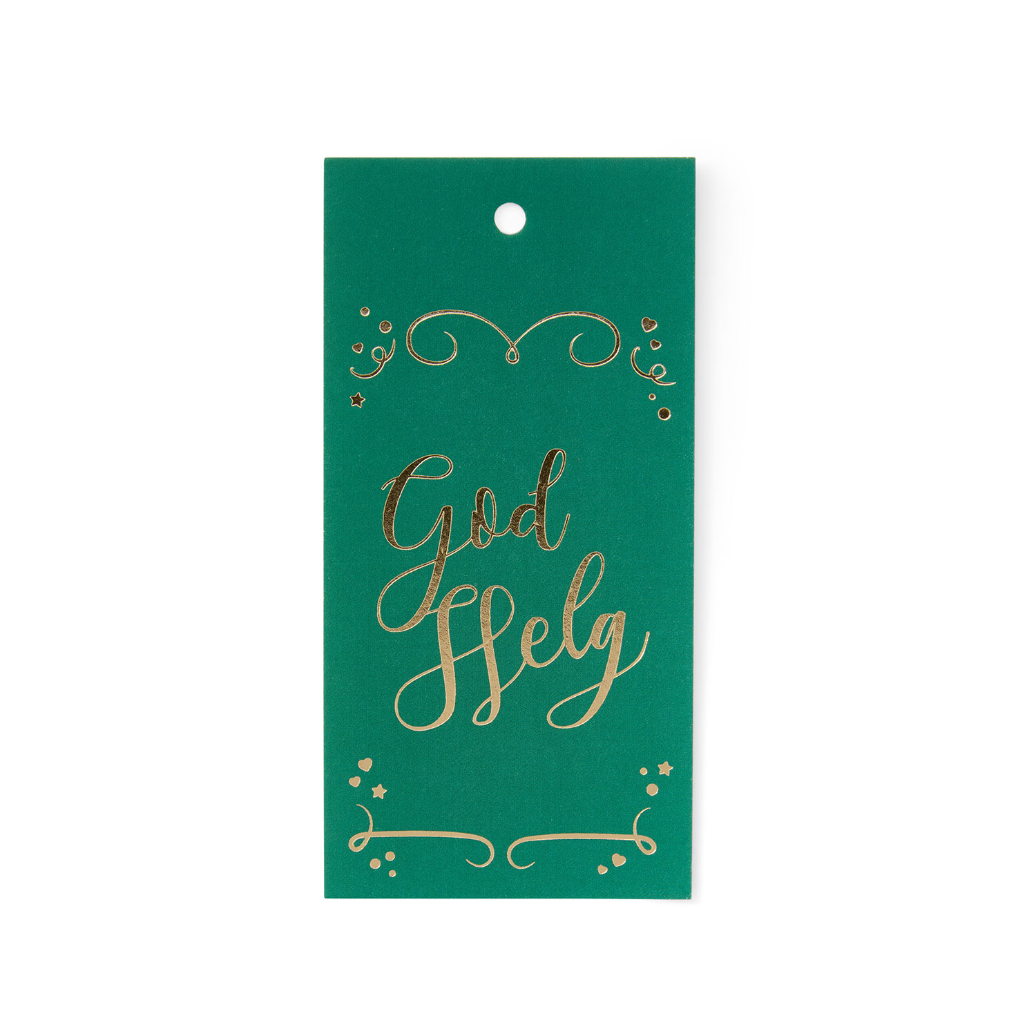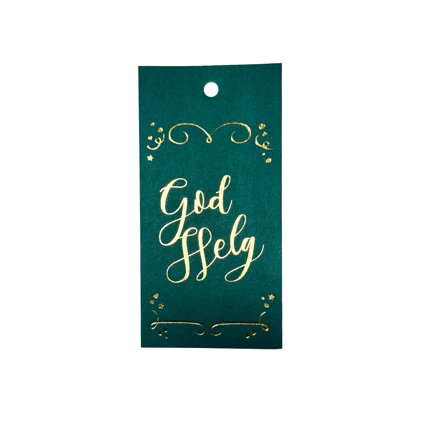 Mörkgrönt kort med texten "God helg" i guldigt tryck.