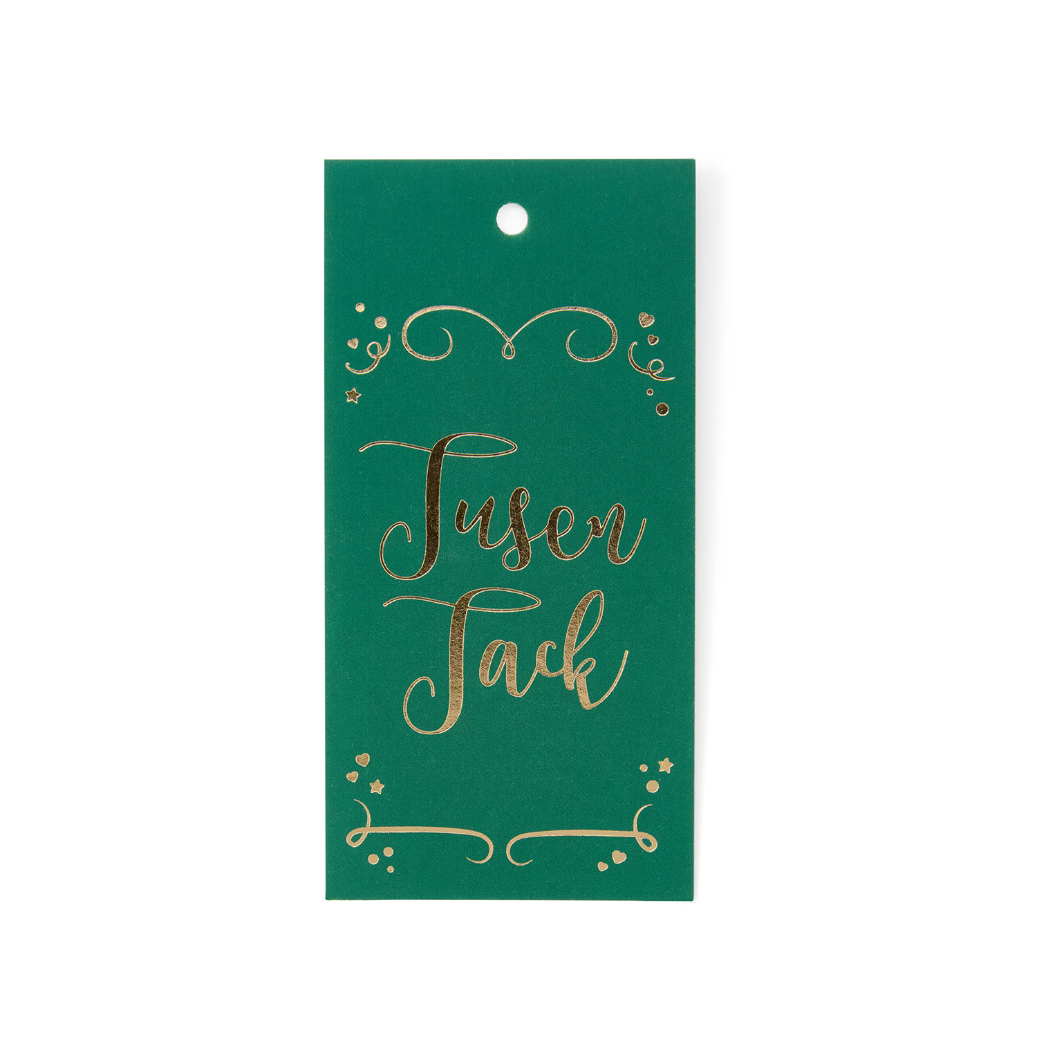 Mörkgrönt kort med texten "Tusen tack" i guldigt tryck.