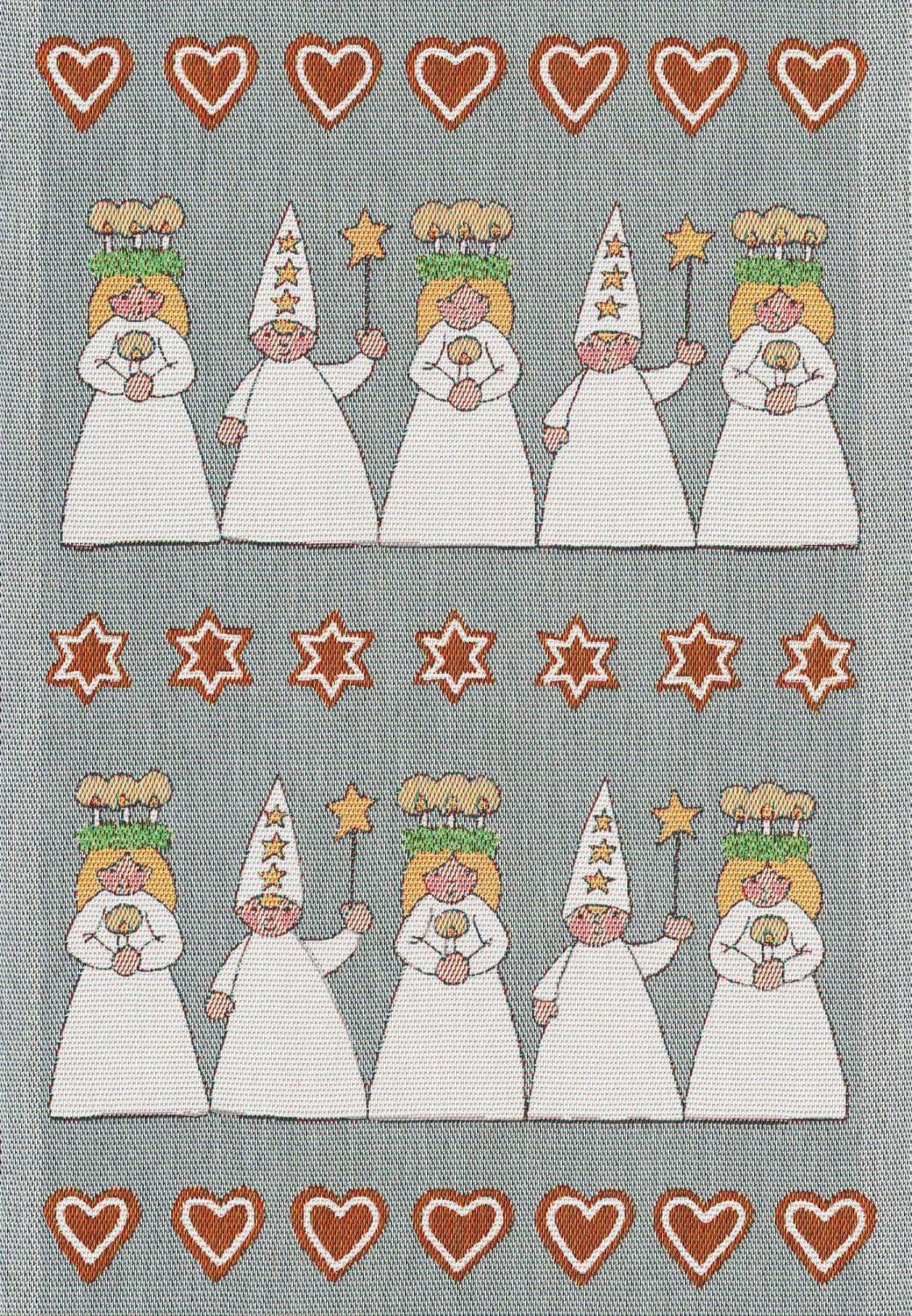 Handduk från Ekelund i ett juligt mönster med vacker lucia tåg, dekorerad med pepparkakor på en grå bakgrund.