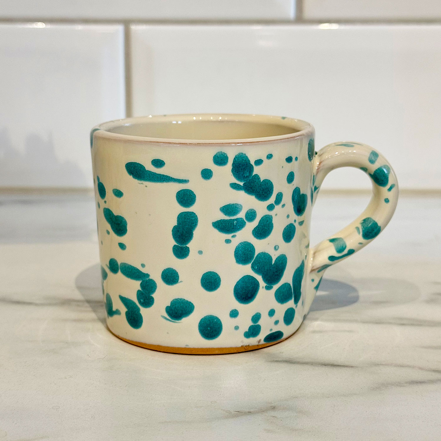 Handgjord mugg från Italien i robust keramik med handtag. Unikt handmålad i klassiskt spruzzimönster med turkosa stänk.