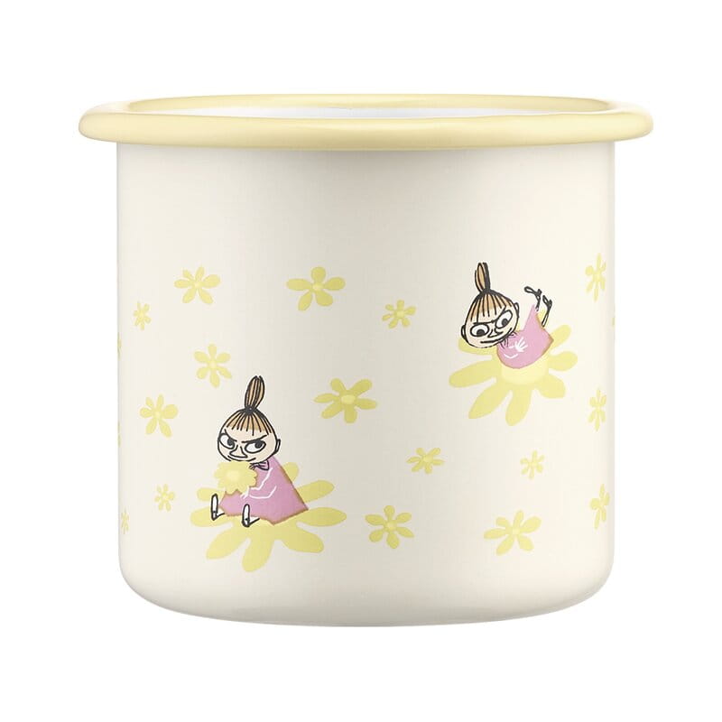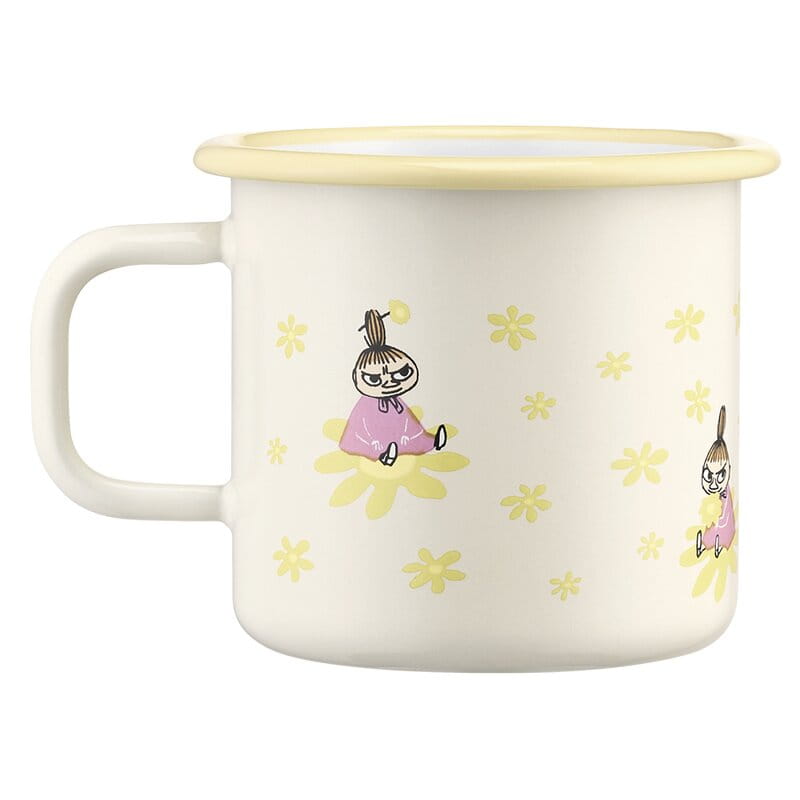 Gul emaljmugg med motiv på Lilla My med gula blommor. Passar för både varma och kalla drycker.
