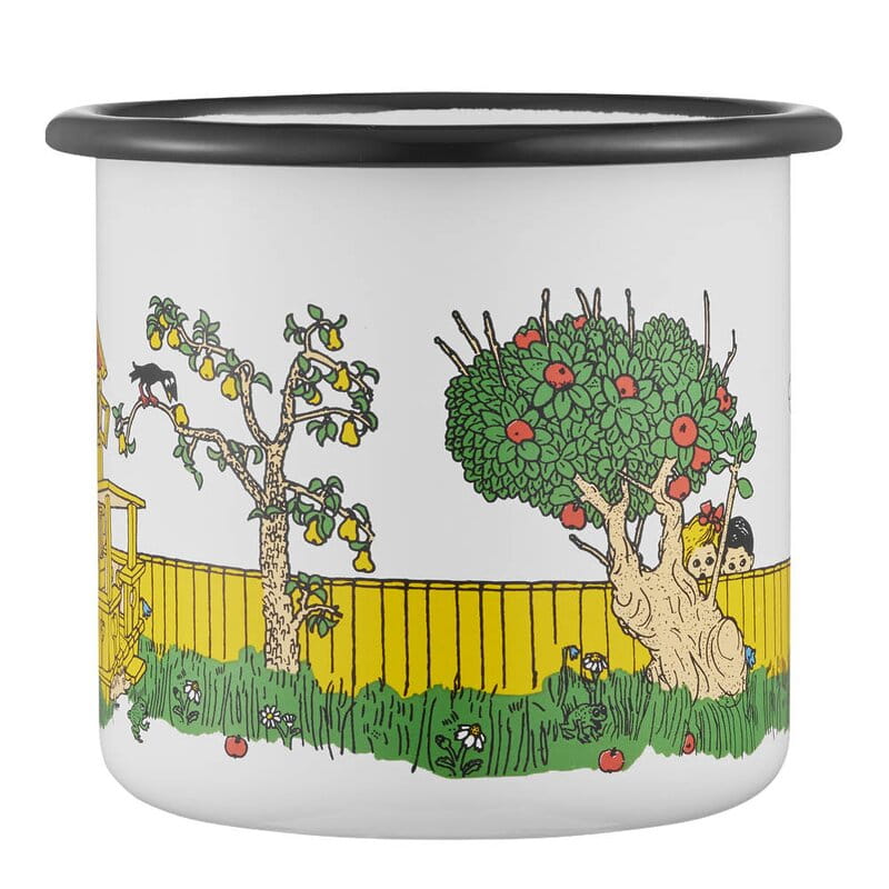Emaljmugg med motiv på en levande trädgård. Pippi bär Lilla Gubben och Annika och Tommy kikar fram bakom planket.