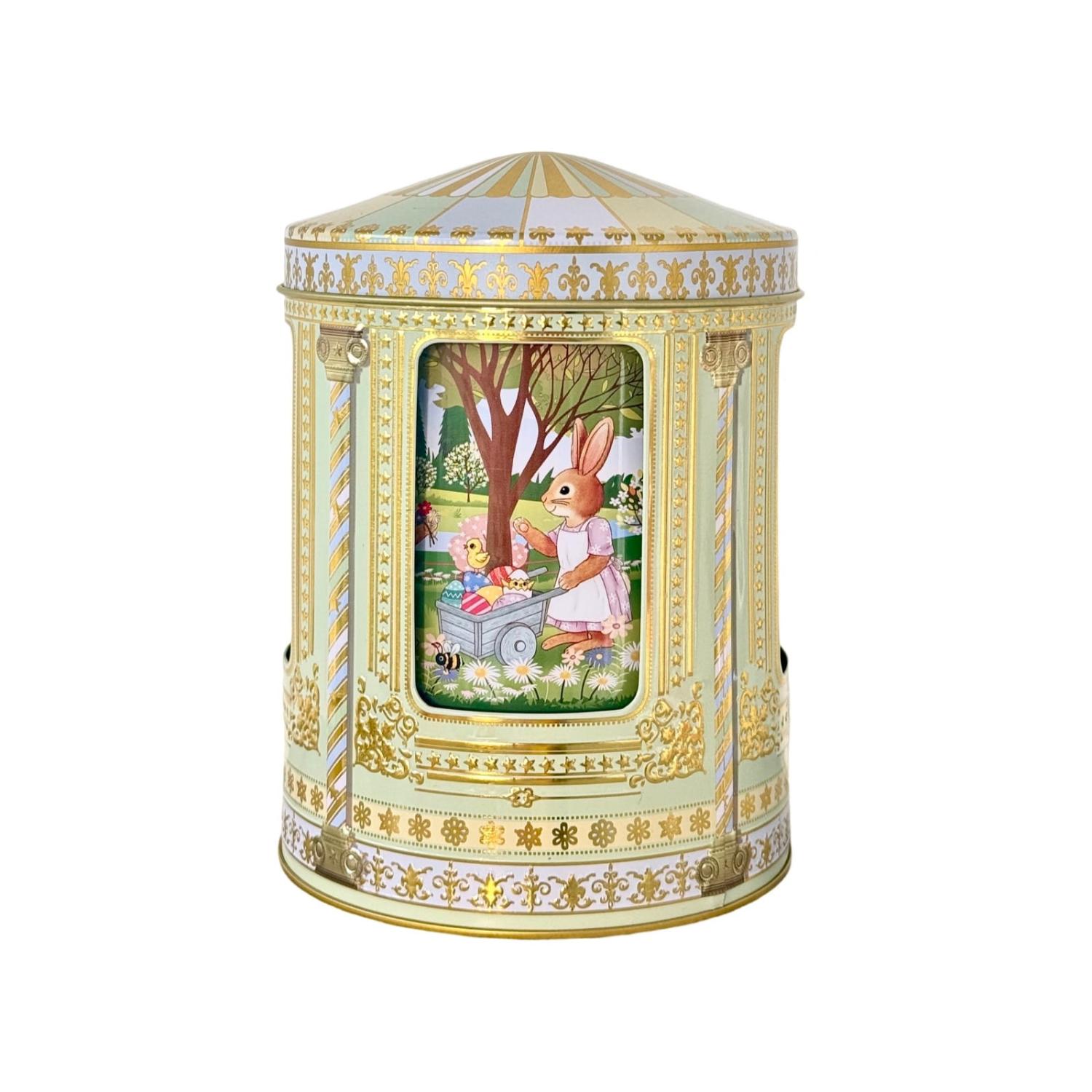 Plåtburk med speldosa som spelar melodin ”Yellow Bird”. Vrid upp karusellen och påskhararna snurrar runt.
