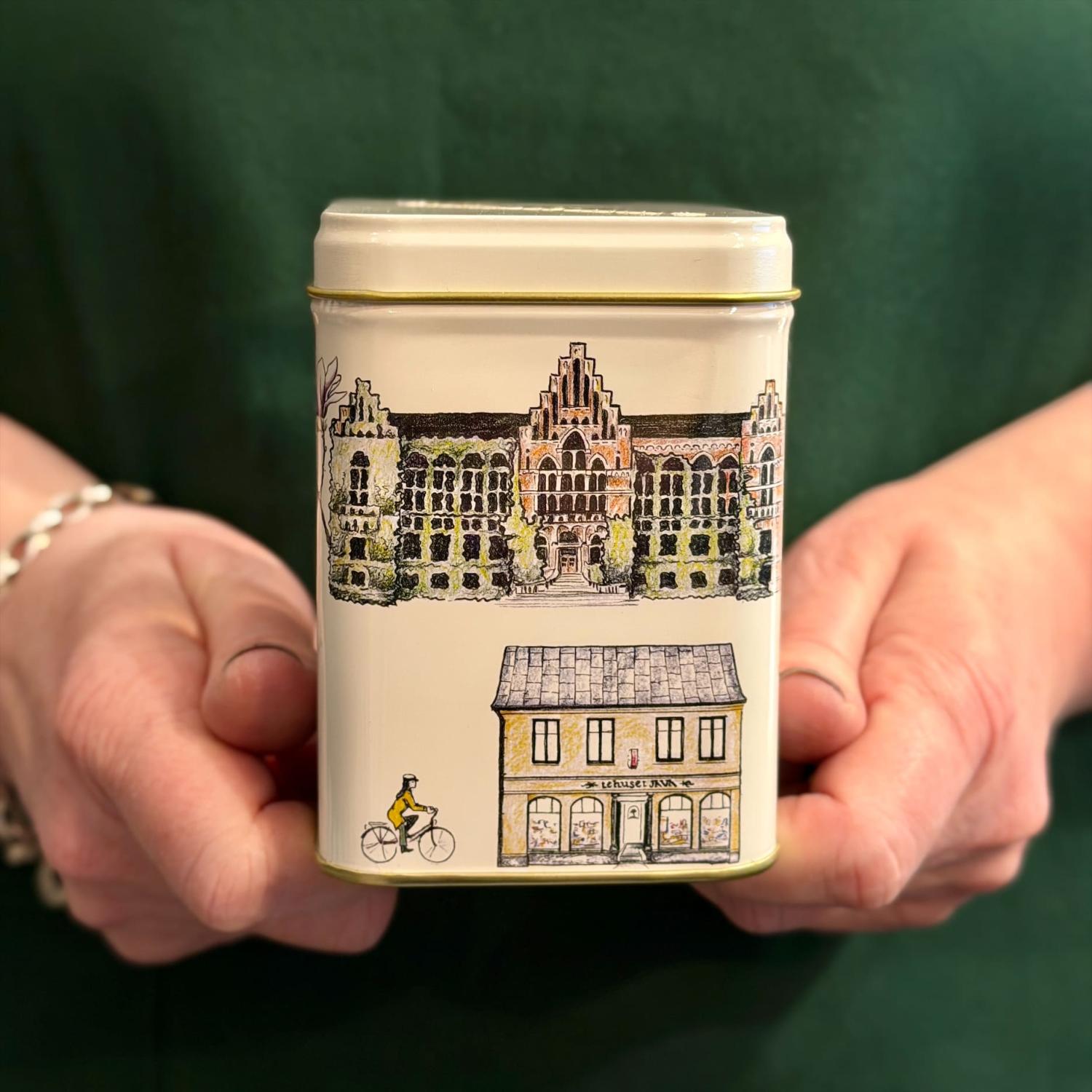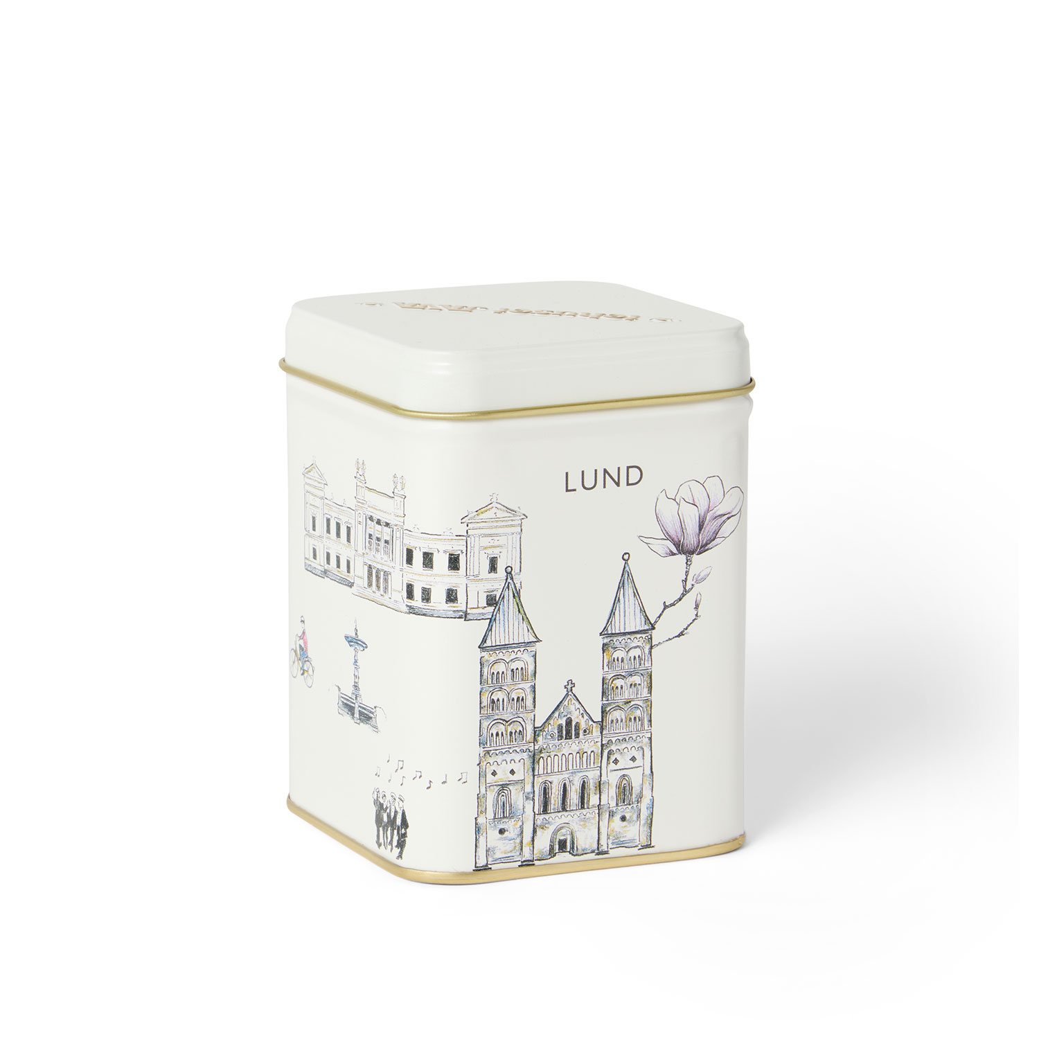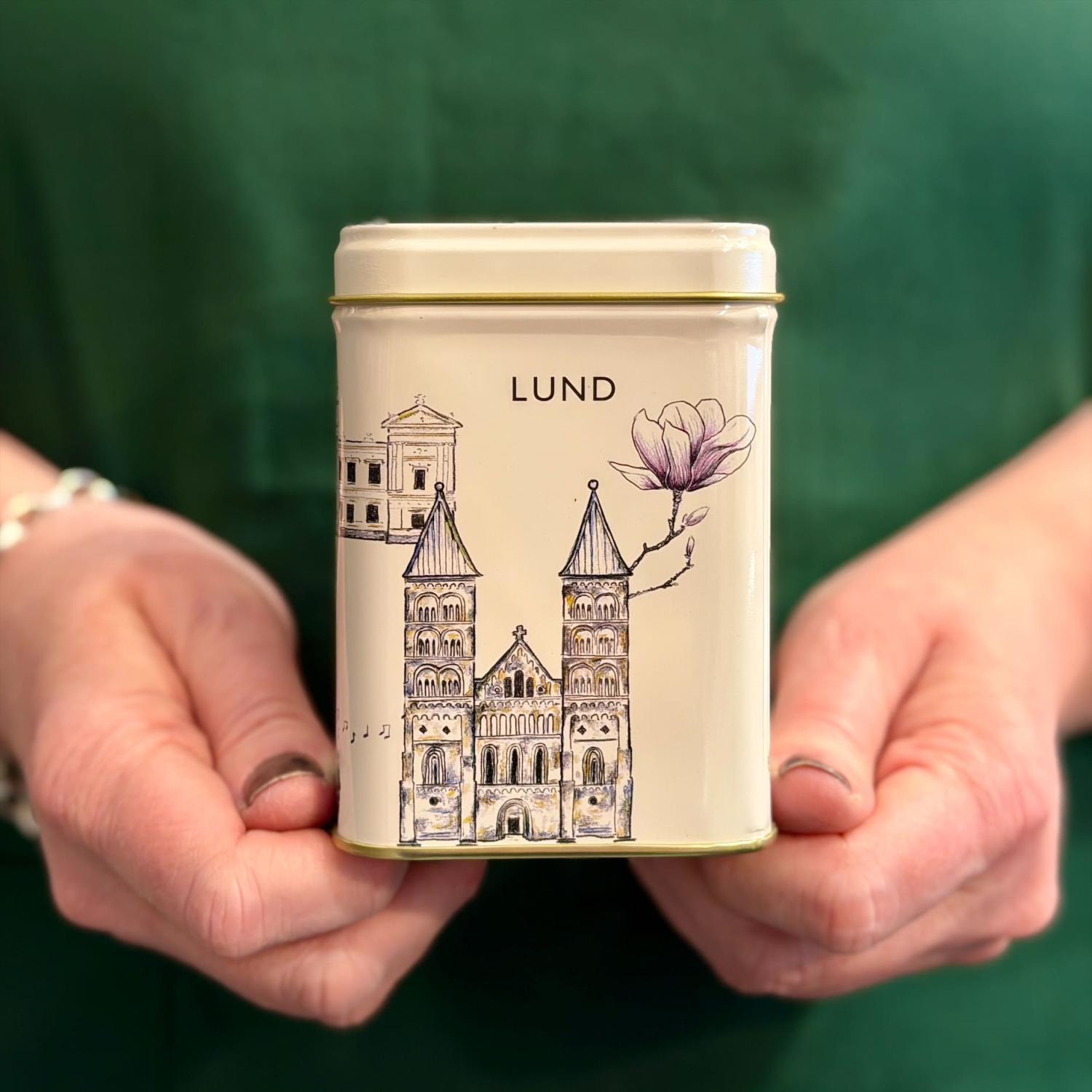 Plåtburk med klassiska byggnader i Lund. Vackert illustrerad av Sofia Kockum som gjort sin tolkning. Rymmer ca 100g te.