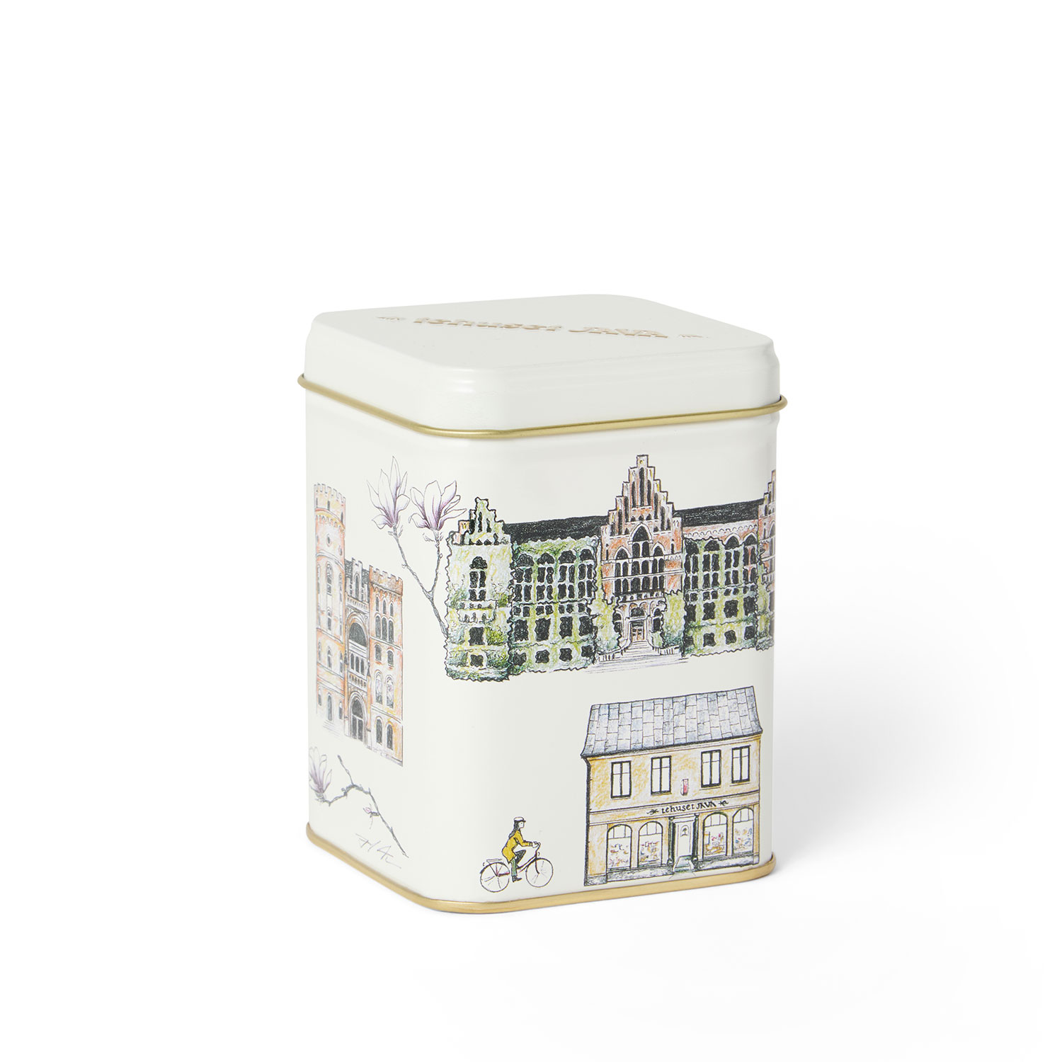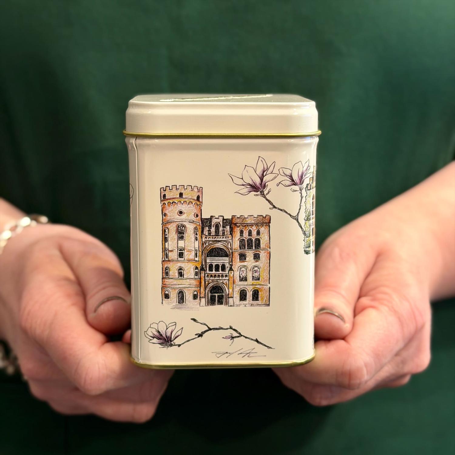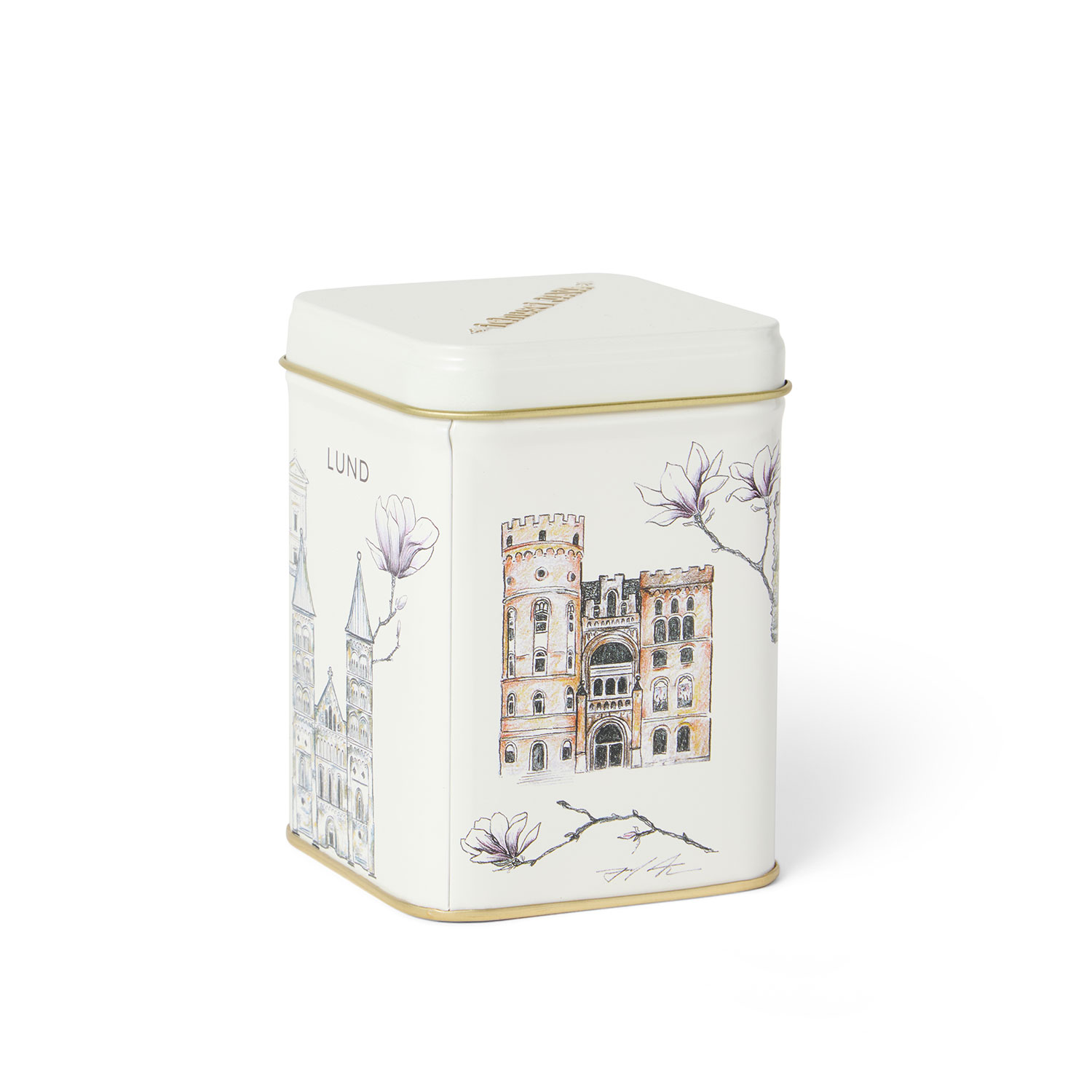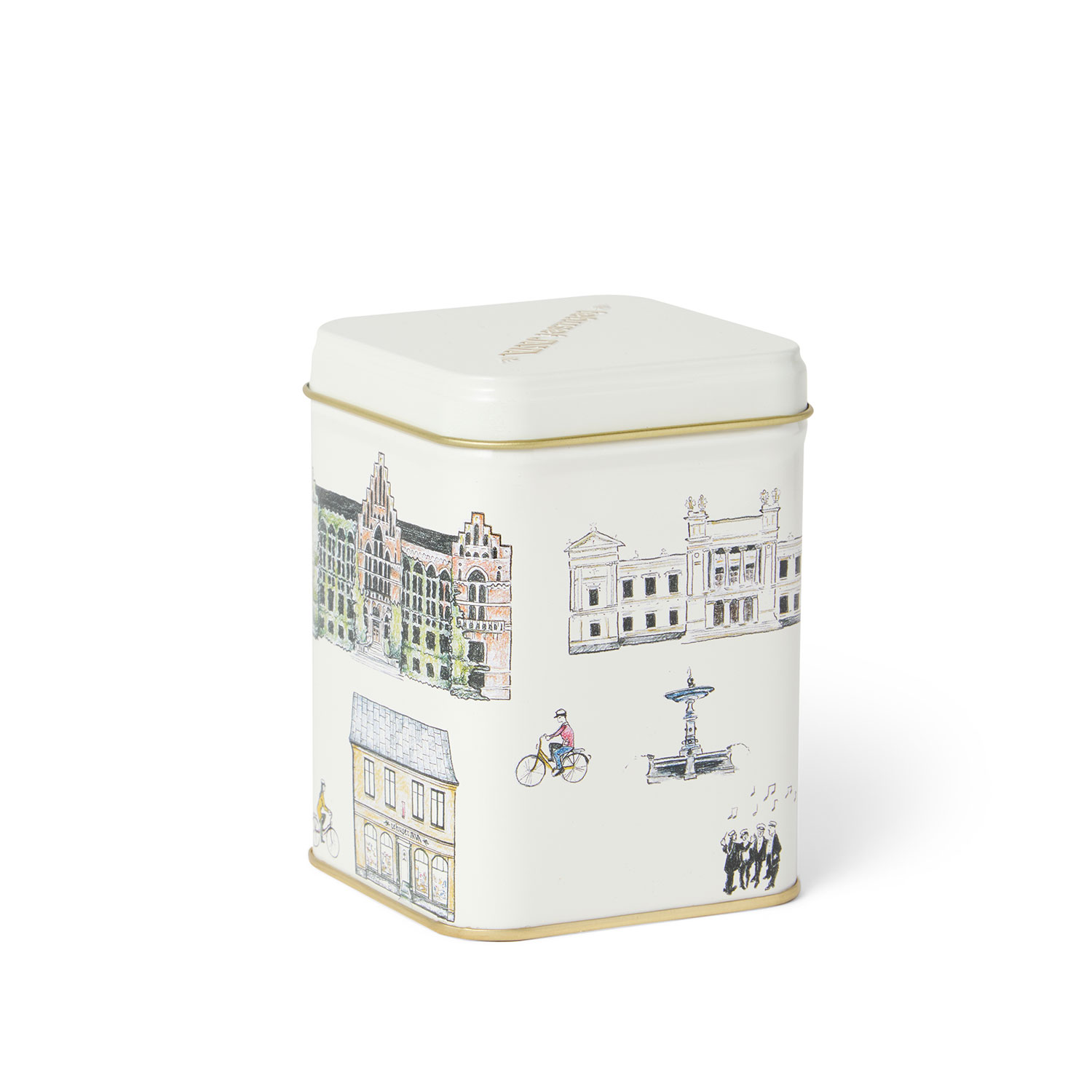 Plåtburk med klassiska byggnader i Lund. Vackert illustrerad av Sofia Kockum som gjort sin tolkning. Rymmer ca 100g te.