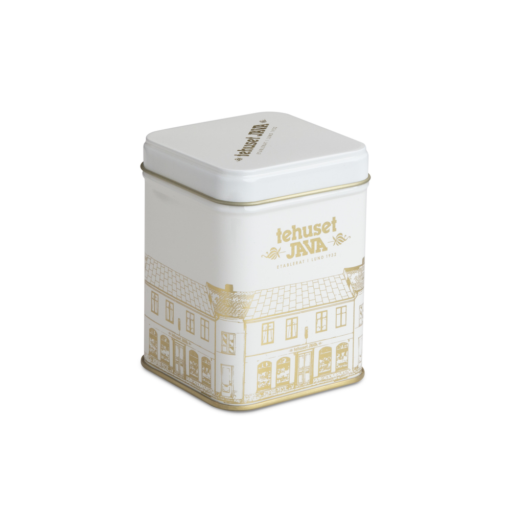 Teburk i plåt med vårt mysiga Lundahus på sidorna. Naturligtvis rekommenderar vi att fylla med Lundablandning, men man kan även förvara andra teer i dem.