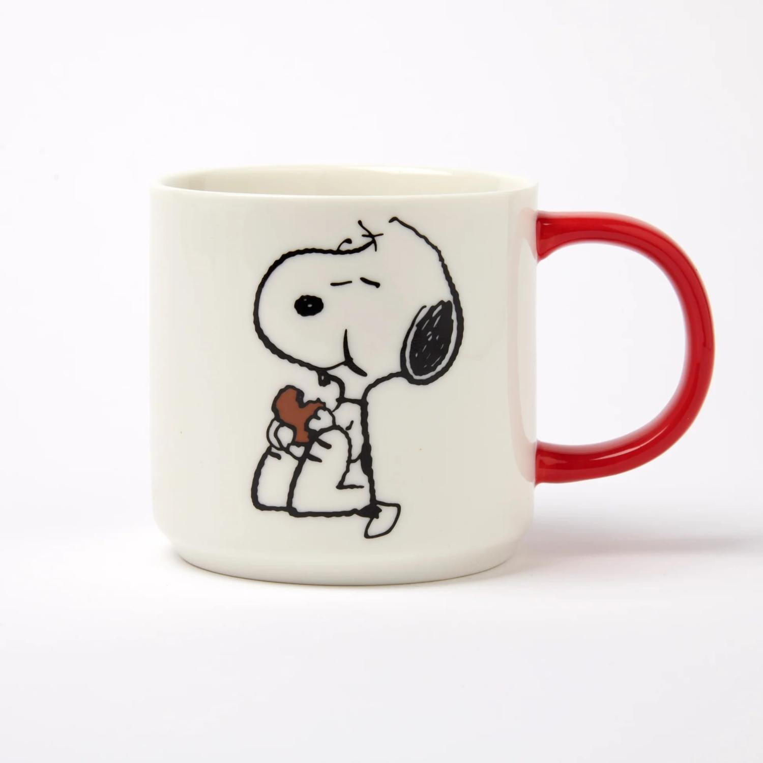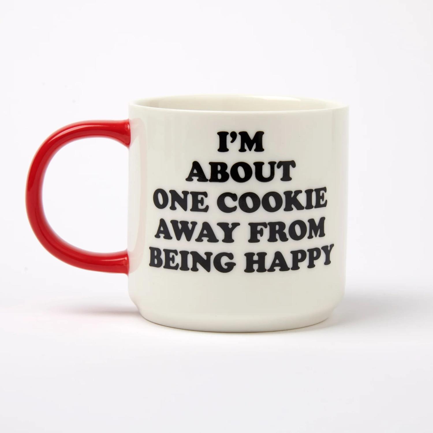 Vit porslinsmugg med rött öra. Motiv med Snobben som äter en kaka, texten ”I´m about one cookie away from being happy” på baksidan.