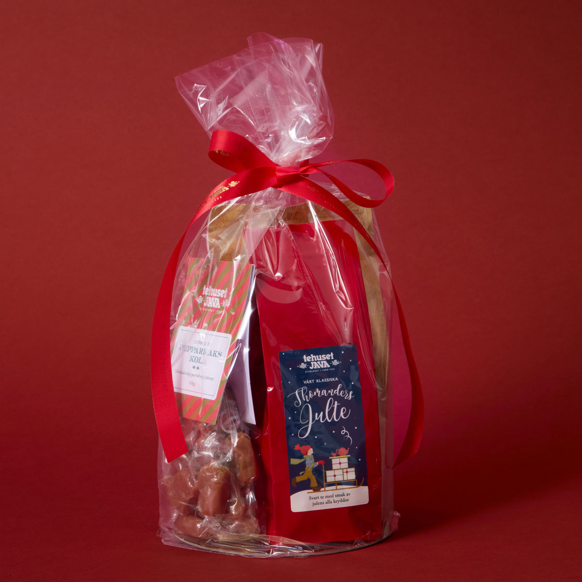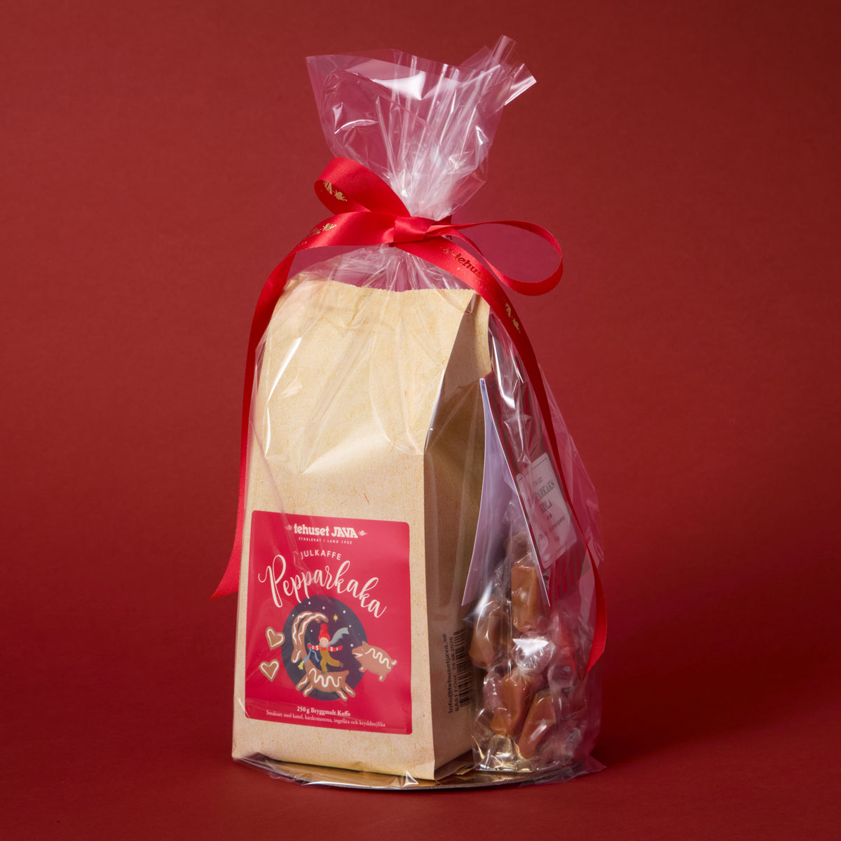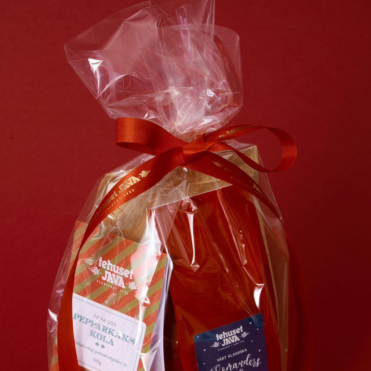 Fin cellofan present med vårat goda pepparkakskaffe, kolor och julte. Ge någon en riktigt härlig fikapaus i jul!