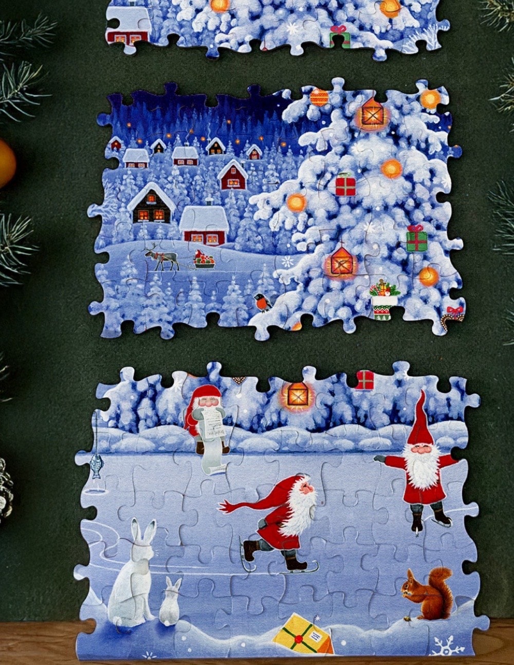 Illustrationen är skapad av Eva Melhuishs och sprudlar av julstämning och fina detaljer som du långsamt får upptäcka. 40 nya bitar om dagen från 1–23 december, och en extra festlig avslutning på julafton med 80 bitar.