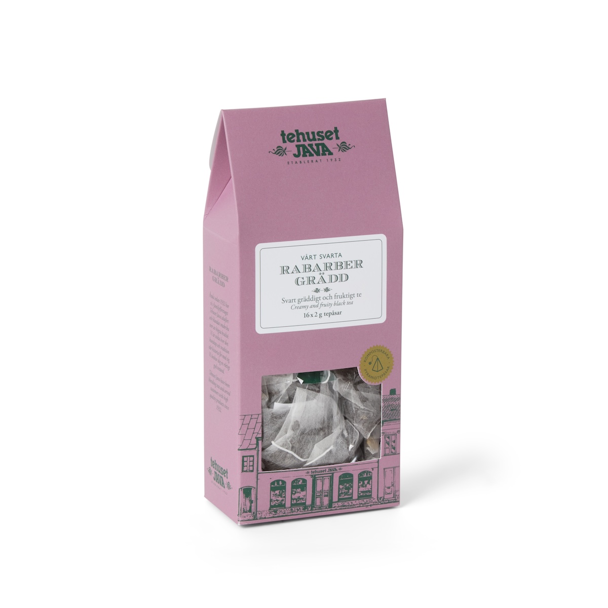 Svart te med frisk smak av rabarber och en krämig smak av gräddvanilj. 16 st komposterbara pyramidtepåsar.