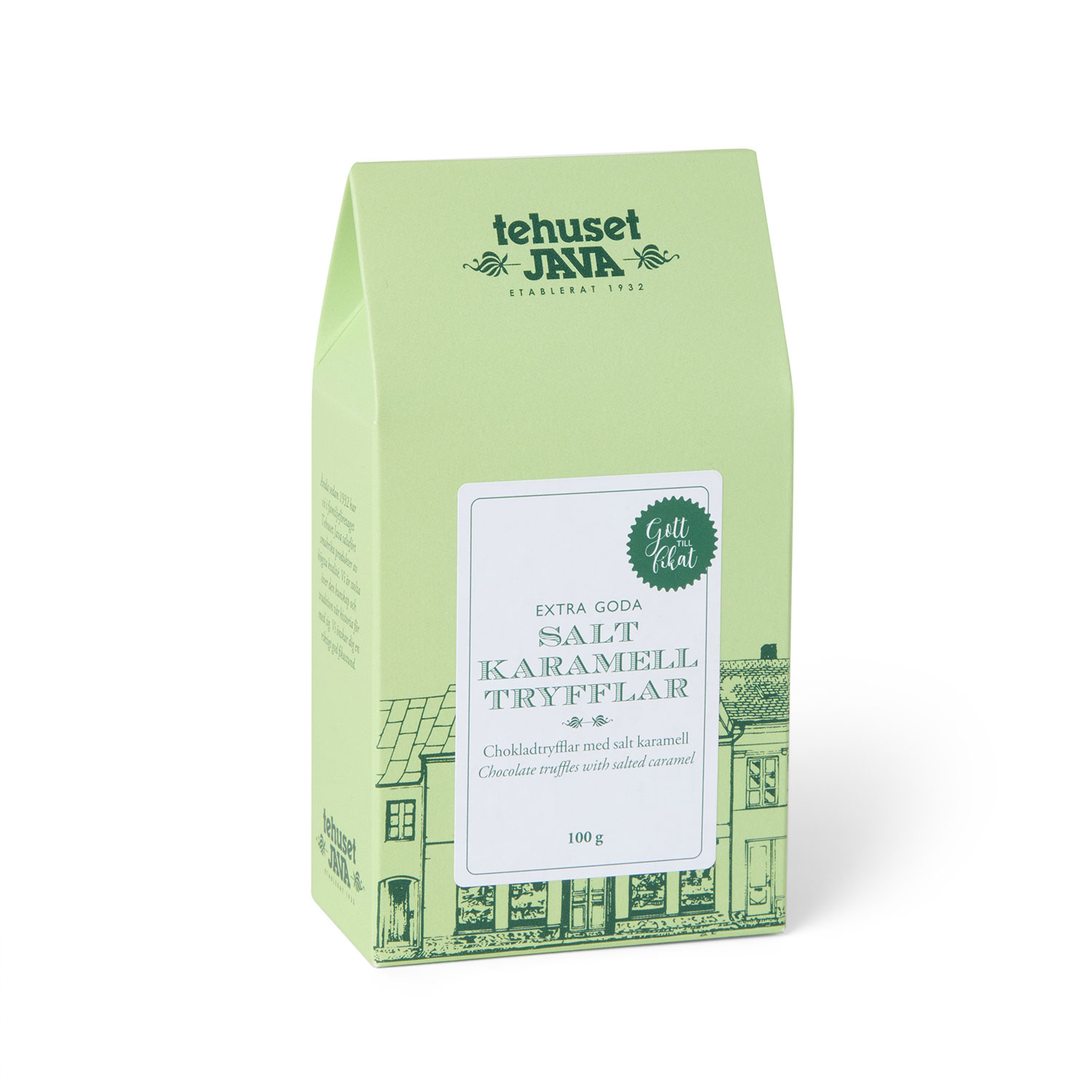 Våra chokladtryfflar med salt karamell. Mjuka och lena som smälter i munnen. Perfekt kombination mellan kraftig choklad och salt karamell.