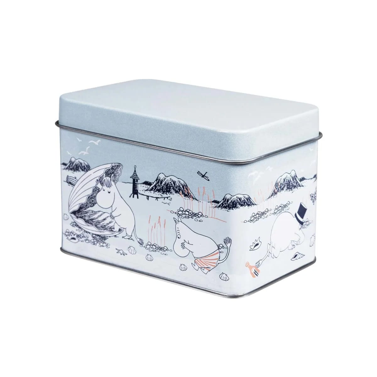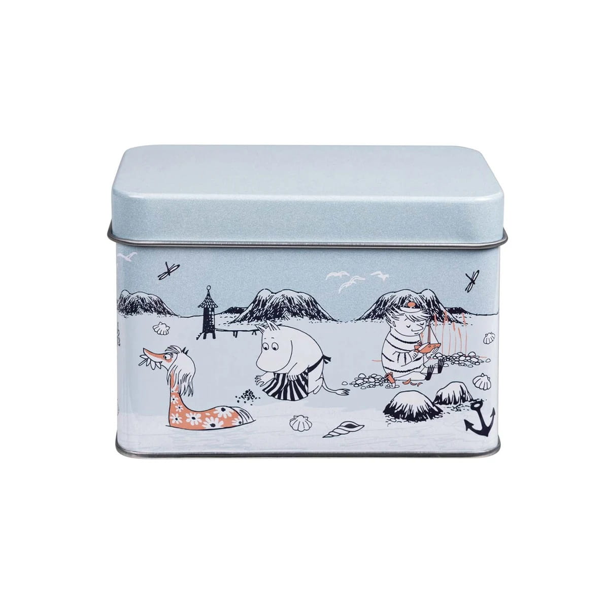 Mumin teburk i blå nyans tillsammans med Muminfigurer på stranden.