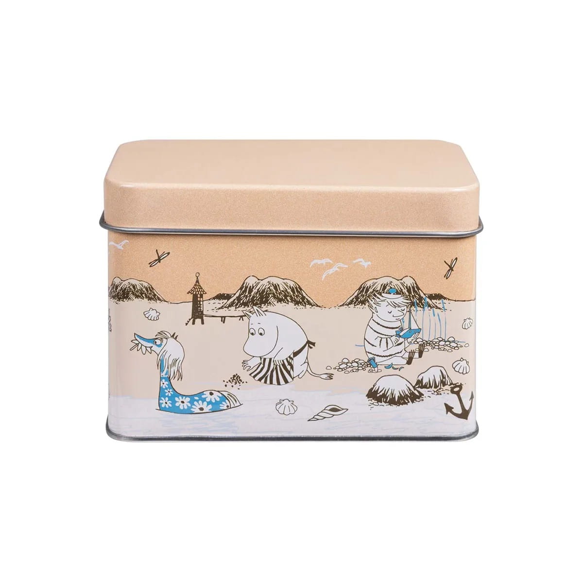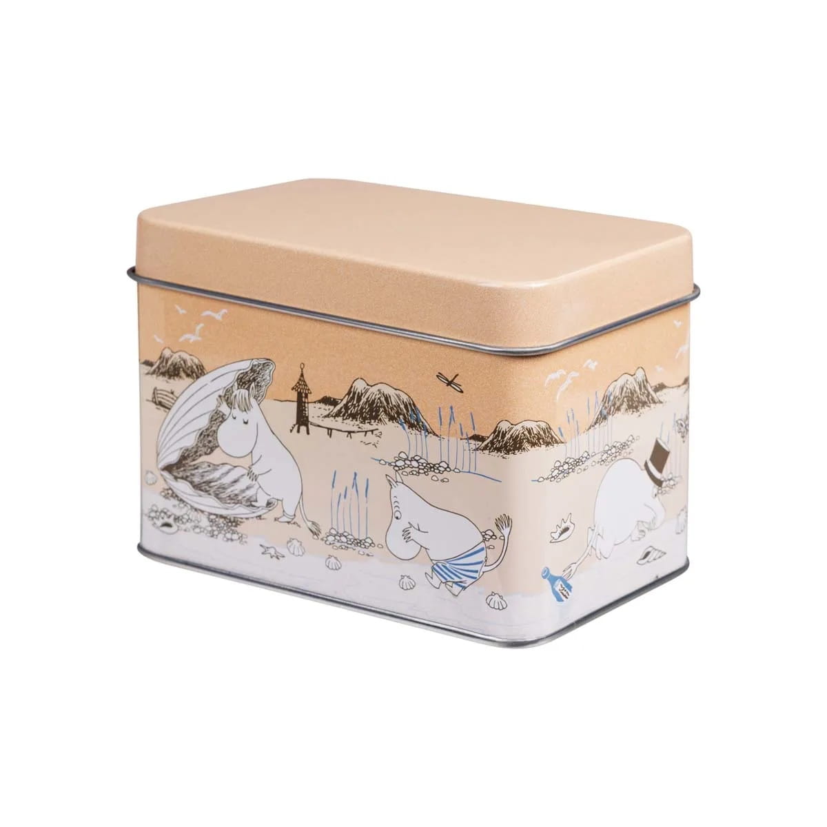 Mumin teburk i orange nyans tillsammans med Muminfigurer på stranden.