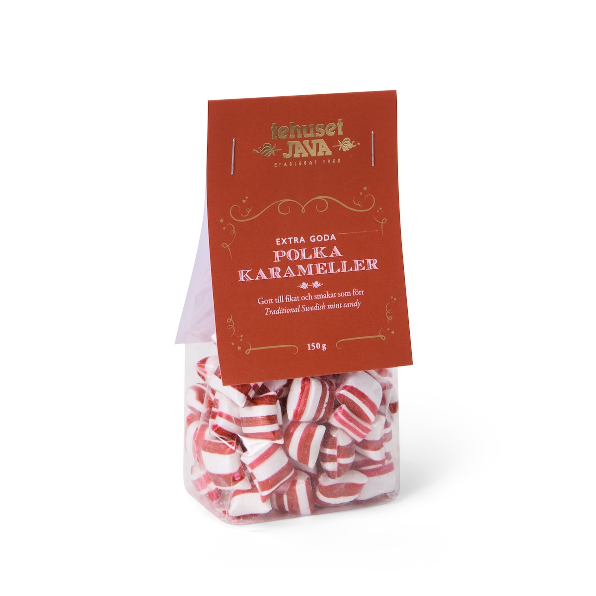 Traditionella polkagriskarameller smaksatta med pepparmintolja. Klassikernas klassiker och ett måste på julens godisbord!