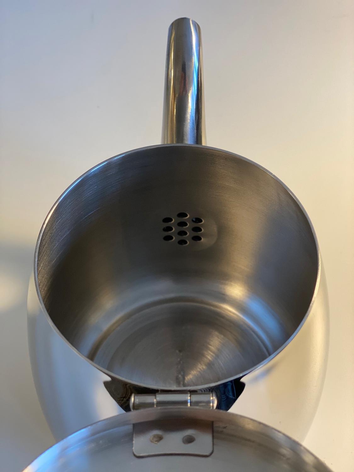 Vacker tekanna i klassisk modell. Tillverkad av tåligt rostfritt stål med blankt putsad yta. Tekannepipen är designad för att droppa så lite som möjligt. Integrerad tesil vid pipens anslutning. Locket sitter fast med praktiskt gångjärn. Rymmer 1 liter.