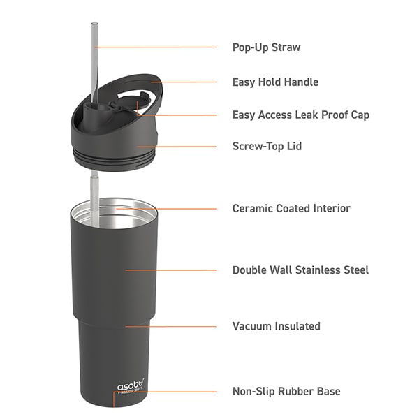 Termosens dubbelväggiga konstruktion i rostfritt stål håller din dryck varm eller kall under lång tid. Det smidiga läckagesäkra locket med pop-up-sugrör gör det enkelt att dricka, och det ergonomiska handtaget ger ett säkert grepp. Sugröret går att ta ut om man föredrar att dricka utan eller hälla upp i en mugg. Flaskan är dessutom designad för att passa i vanliga mugghållare.