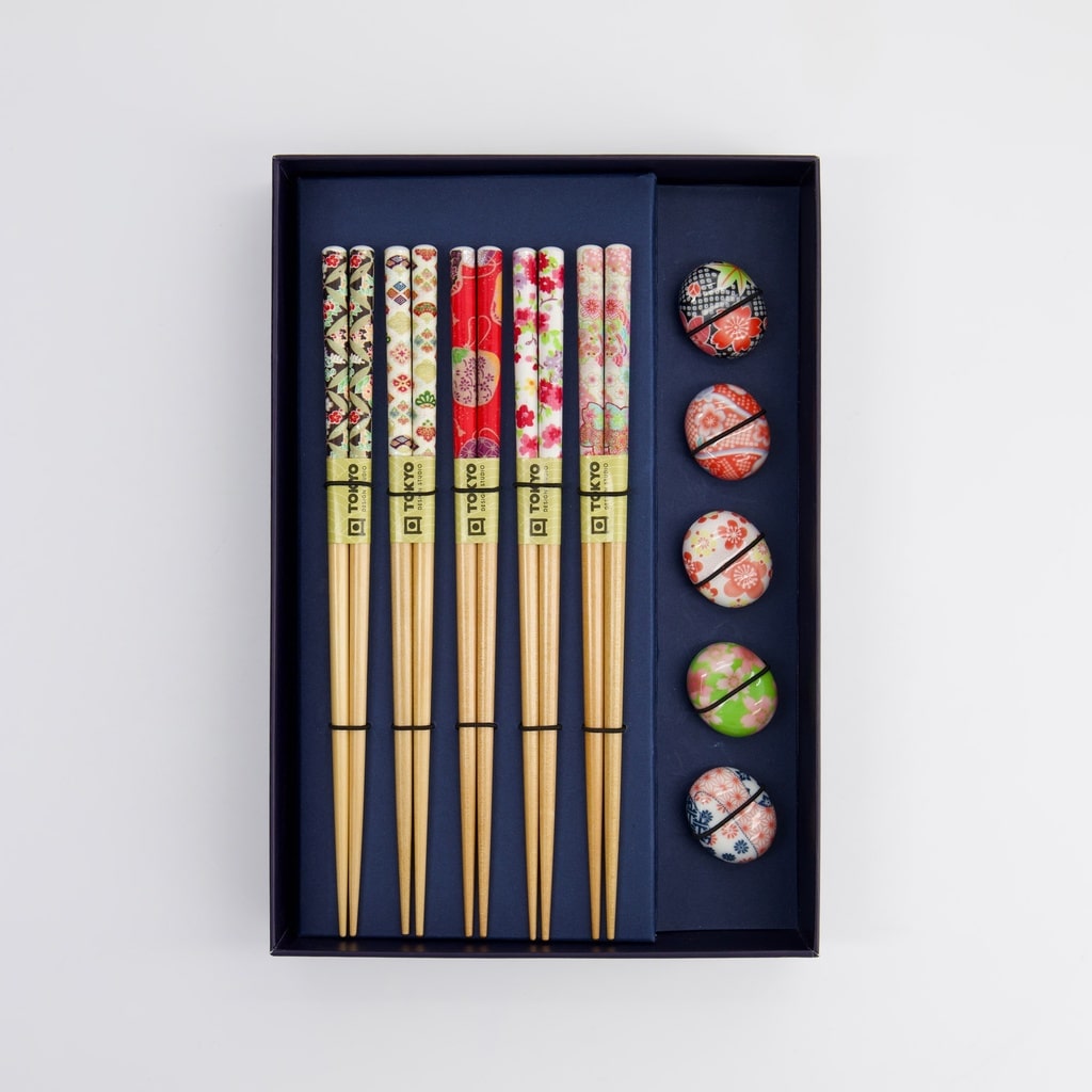 Upptäck en vacker kombination av tradition och elegans med detta exklusiva set, perfekt som gåva eller för att förgylla din egen dukning. Setet innehåller 5 par stilfulla ätpinnar i trä, var och en kompletterad med en porslinshållare i klassiskt japanskt mönster.