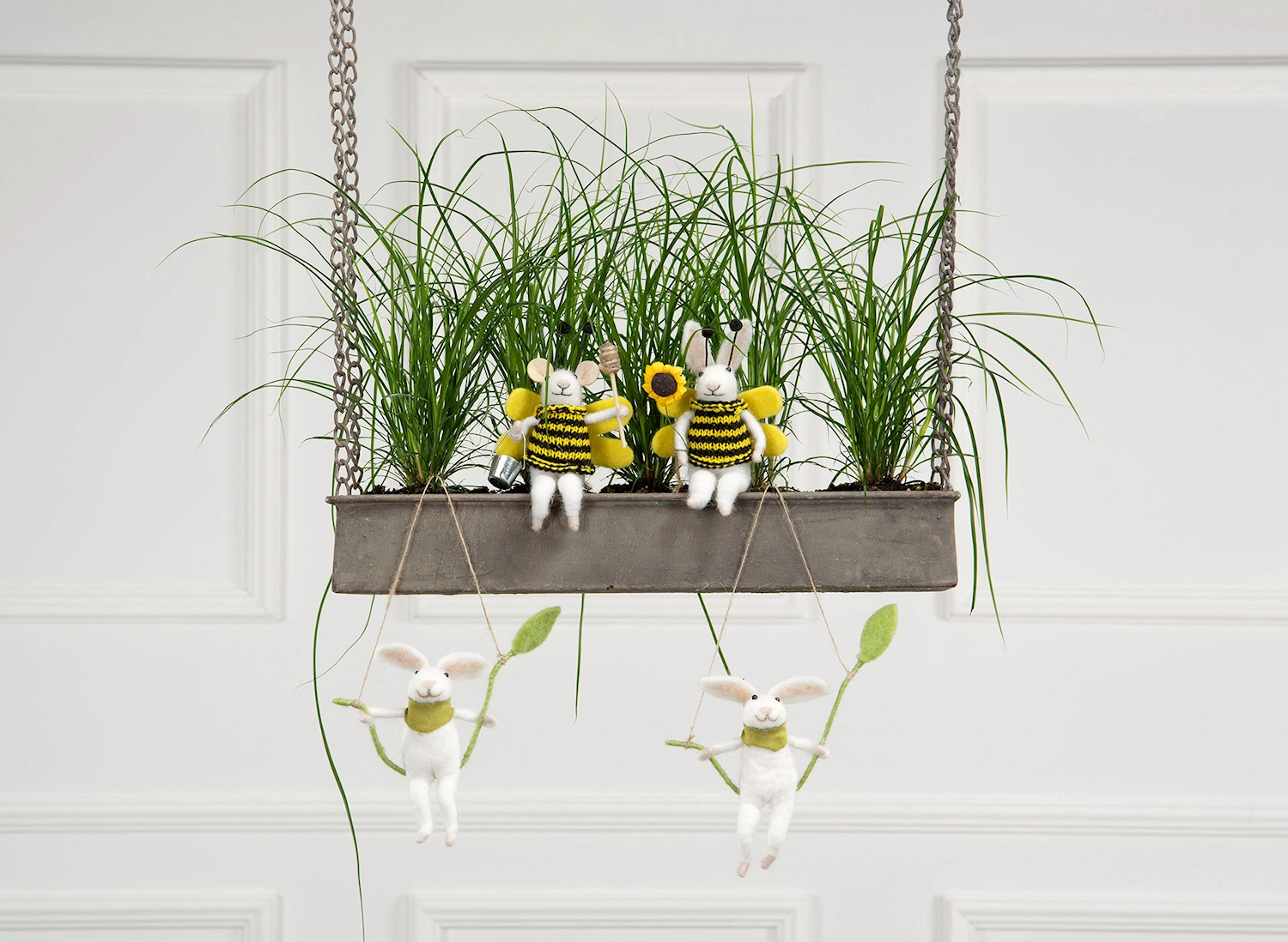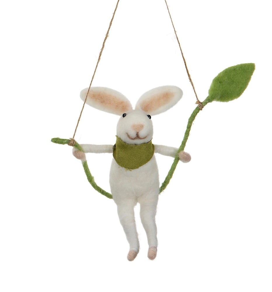 Söt liten kanin på en gunga, i ull och måttet 17x6x18cm. Perfekt att hänga i påskriset.