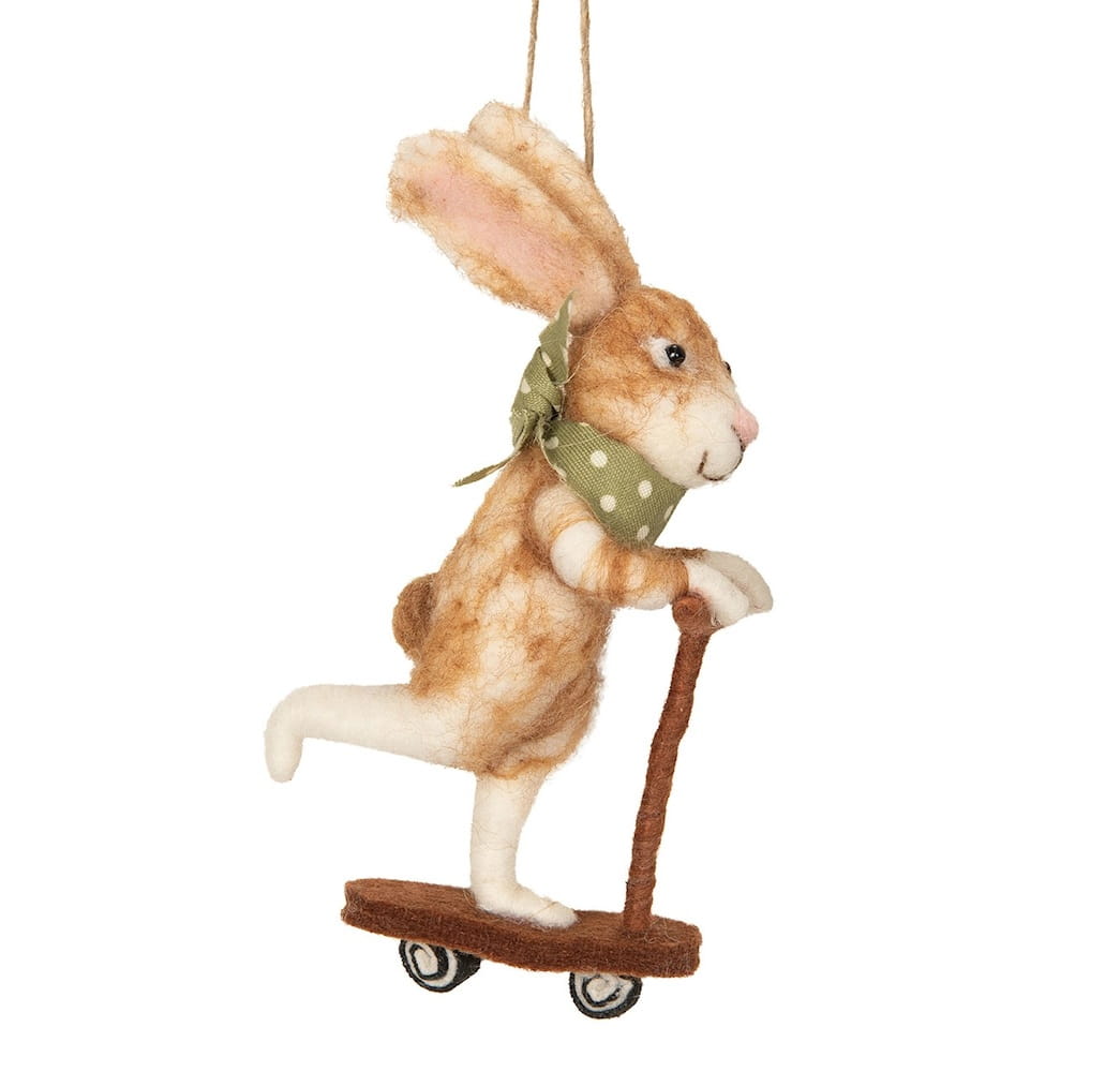 Söt liten brun kanin som åker spark, i ull och måttet 9x5,5x14,5 cm. Perfekt att hänga i påskriset.