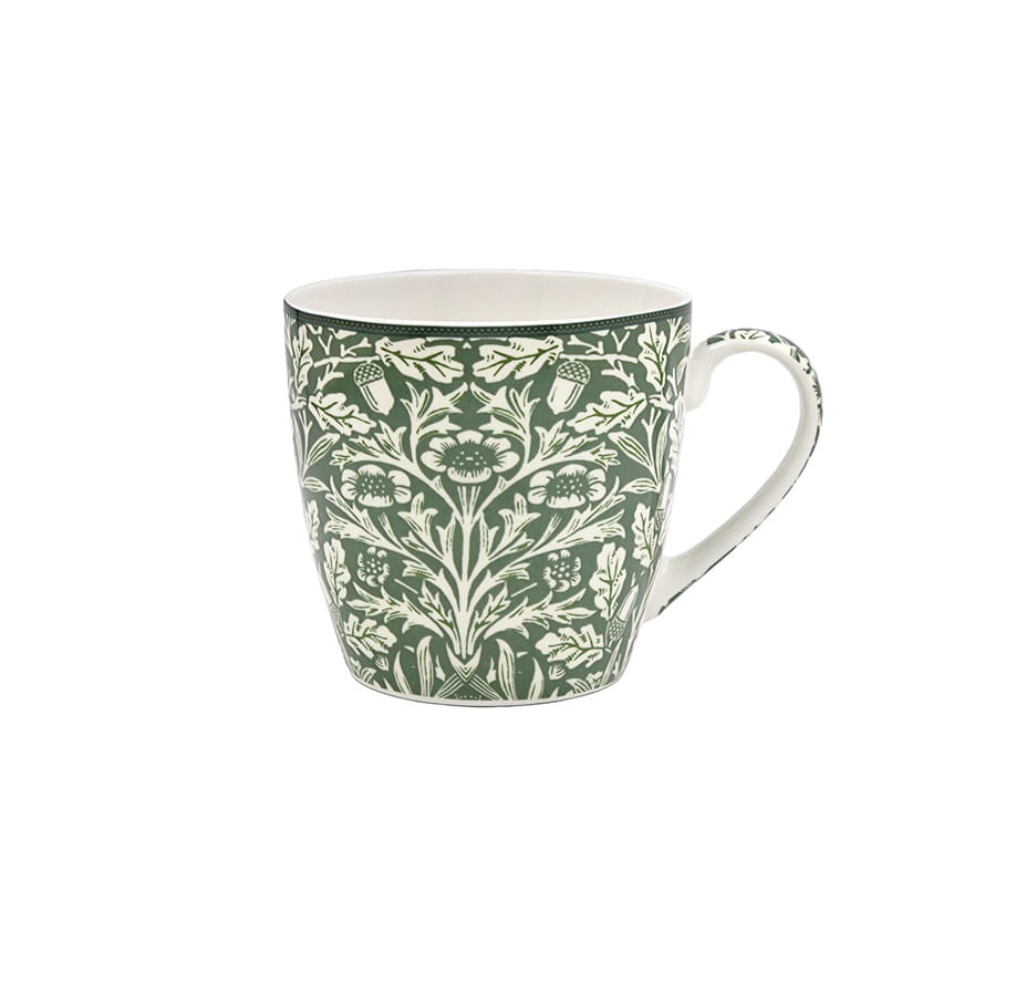 Grön vit mönstrad frukostmugg i William Morris mönster Acorn. Passar både till te och kaffe.